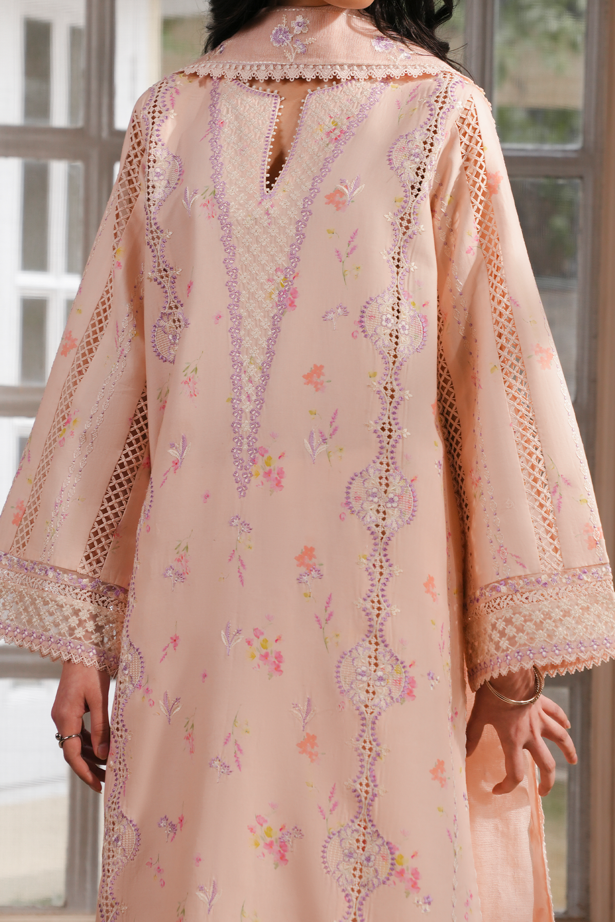 Soft and radiant in a tropical peach printed base, this ensemble blends botanical-inspired elements with intricate craftsmanship. The shirt is delicately embroidered with botanical inspired elements on fine chicken kari, tracing floral motifs that add texture and airy elegance to the silhouette. Subtle pastel accents run through the print, giving the piece a fresh, garden-like charm. A cotton net embroidered dupatta drapes lightly over the look, sheer and detailed, enhancing the softness of the palette. The trousers echo the gentle tone, tailored wide with embroidered finishing and lace accents at the hem, completing the outfit with a refined, cohesive grace.