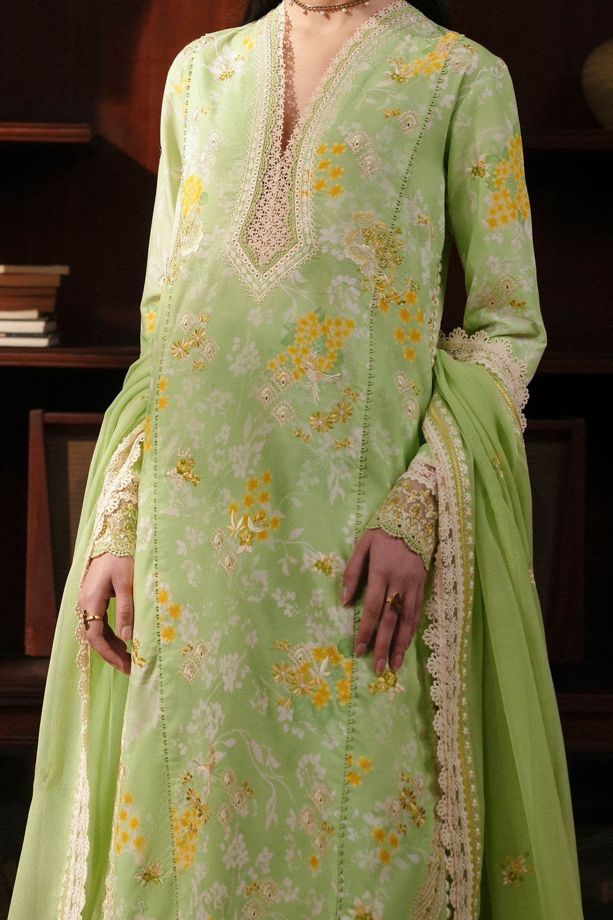This ensemble is rendered in an apple green print, layered with botanical floral bunch motifs that evoke freshness and natural charm. The shirt is elevated with Parsi Gara–inspired embroidery, weaving heritage artistry into its surface with intricate finesse. A fluid embroidered chiffon dupatta, framed with delicate detailing, drapes gracefully to complete the look, while the matching trousers carry subtle accents that ensure balance and cohesion. Together, the interplay of print, embroidery, and flowing textures creates a refined outfit that celebrates tradition with contemporary elegance.
