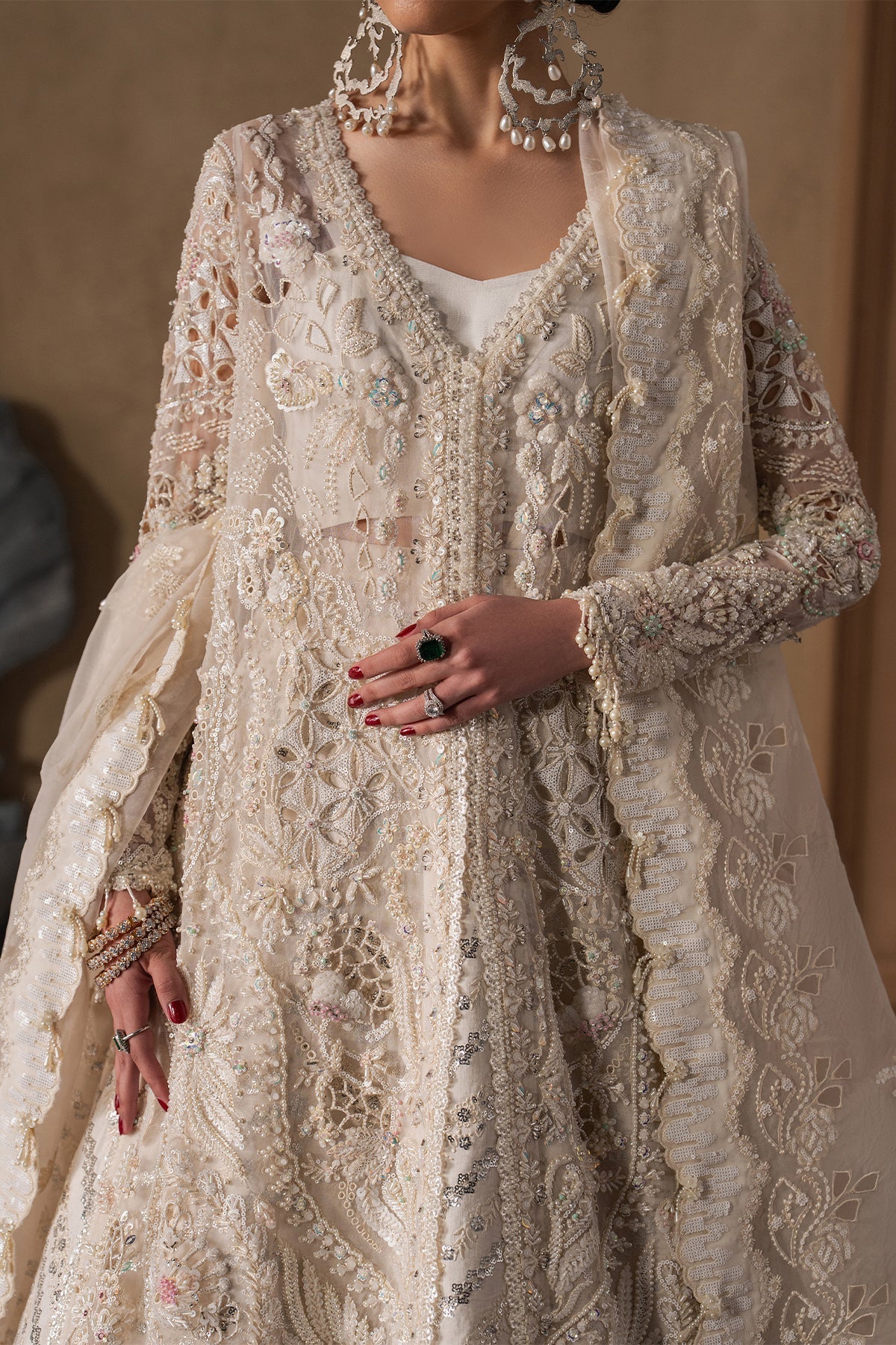 A luminous ivory ensemble brought to life through exquisite hand craftsmanship and quiet grandeur. Intricate embroidery in soft metallic hues weaves across the surface in delicate florals and trailing patterns, enriching the silhouette with texture and depth. The lehenga falls with graceful volume, its borders and panels unfolding in measured detail that speaks of heritage refinement. A sheer dupatta, ornate yet weightless, is framed with elaborate lacework and subtle motifs, lending fluidity and romance to the structured elegance of the attire. Majestic yet tender, the look is a portrait of bridal poise — where tradition, artistry, and timeless beauty exist in perfect harmony.