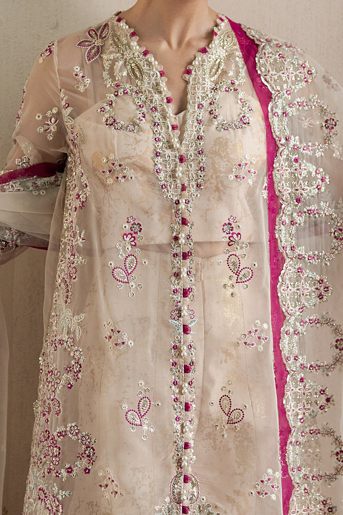 This ethereal ivory ensemble is adorned with intricate thread work and sequins in shades of fuchsia and silver. The long, graceful silhouette is complemented by sheer embroidered sleeves and scalloped detailing that adds a touch of refinement. Paired with a coordinated dupatta edged in bold fuchsia borders and delicate motifs, the look strikes the perfect balance between soft femininity and striking elegance. A timeless choice for festive occasions and evening celebrations where grace meets grandeur.