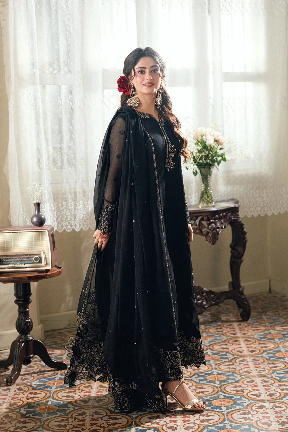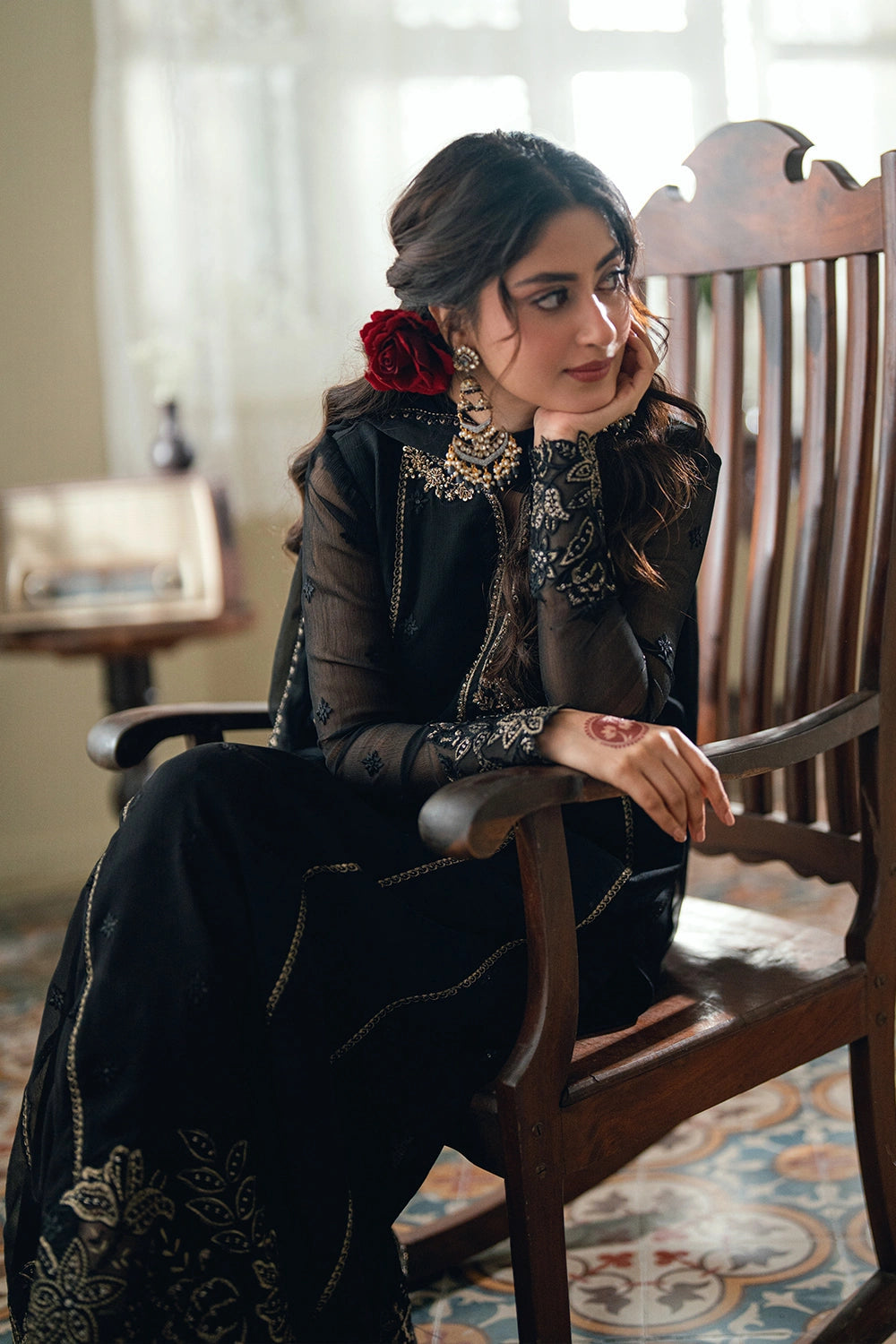 Nightingale is a sleek black chiffon three-piece, exuding understated sophistication. Featuring a hand-embellished neckline and tailored straight pants for a modern, refined fit. A striking ensemble where elegance meets contemporary charm.