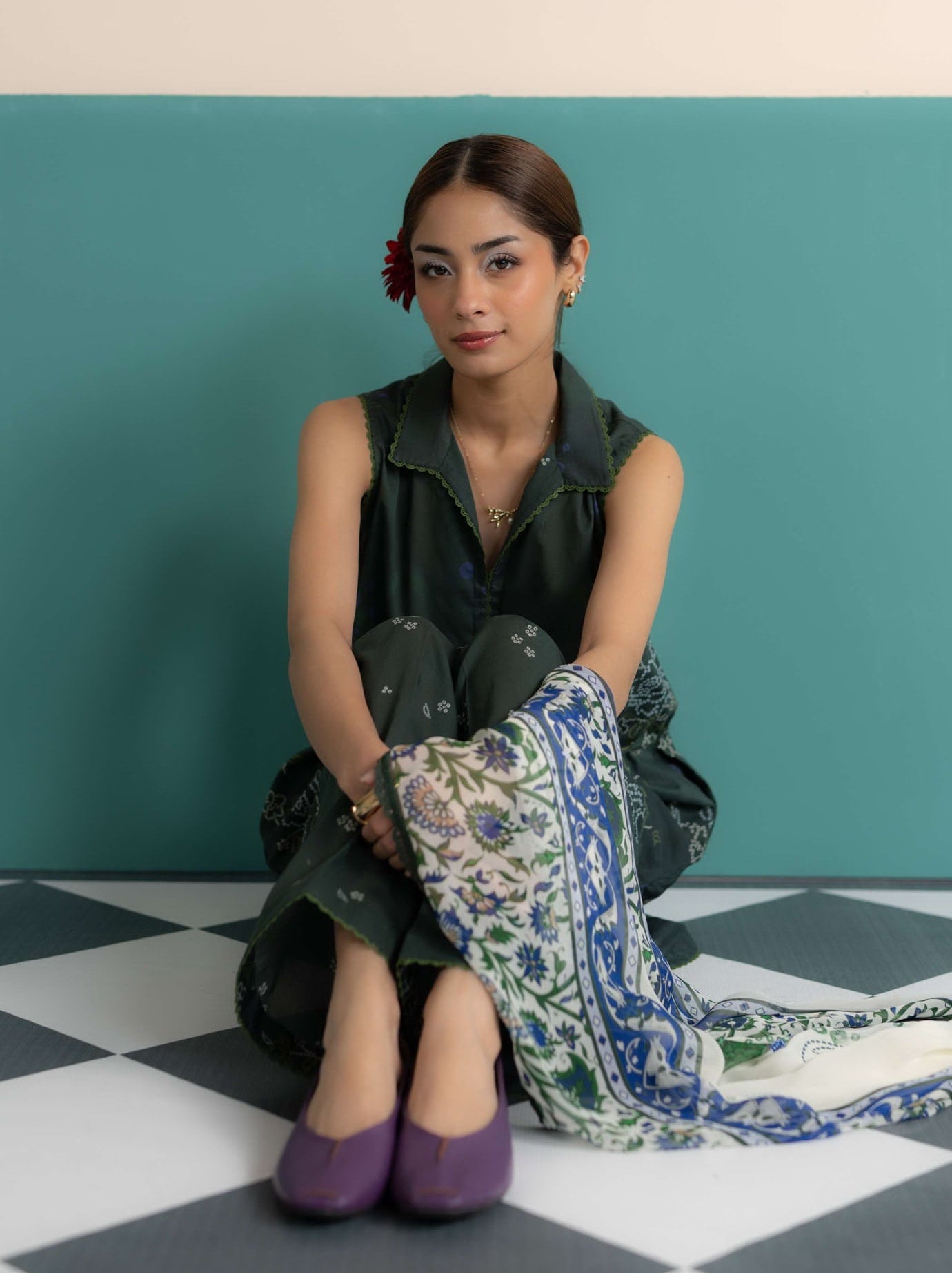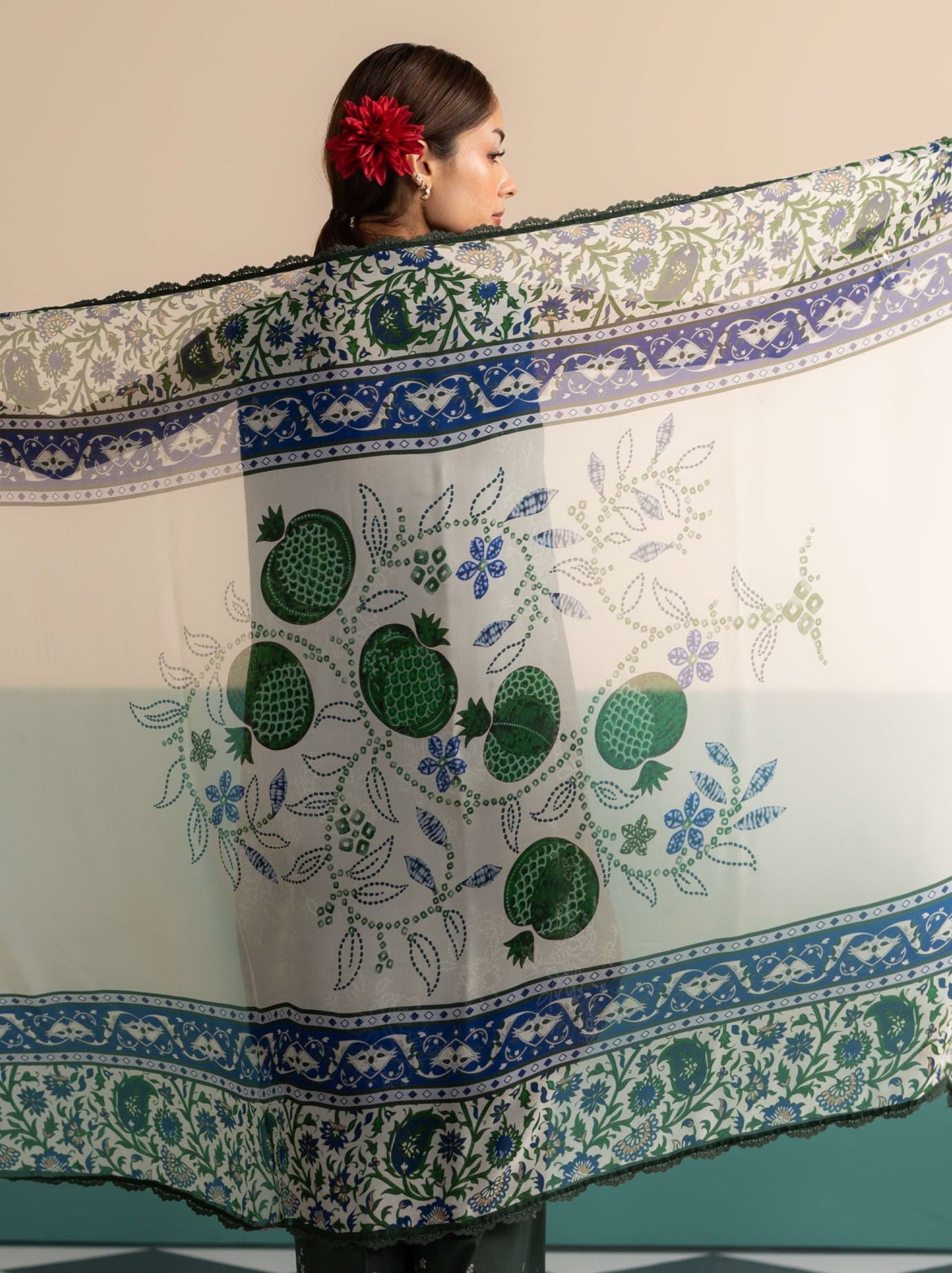 - A blue-on-ivory shirt with ivory trouser, paired with a flowing silk dupatta-light, balanced, and made for summer