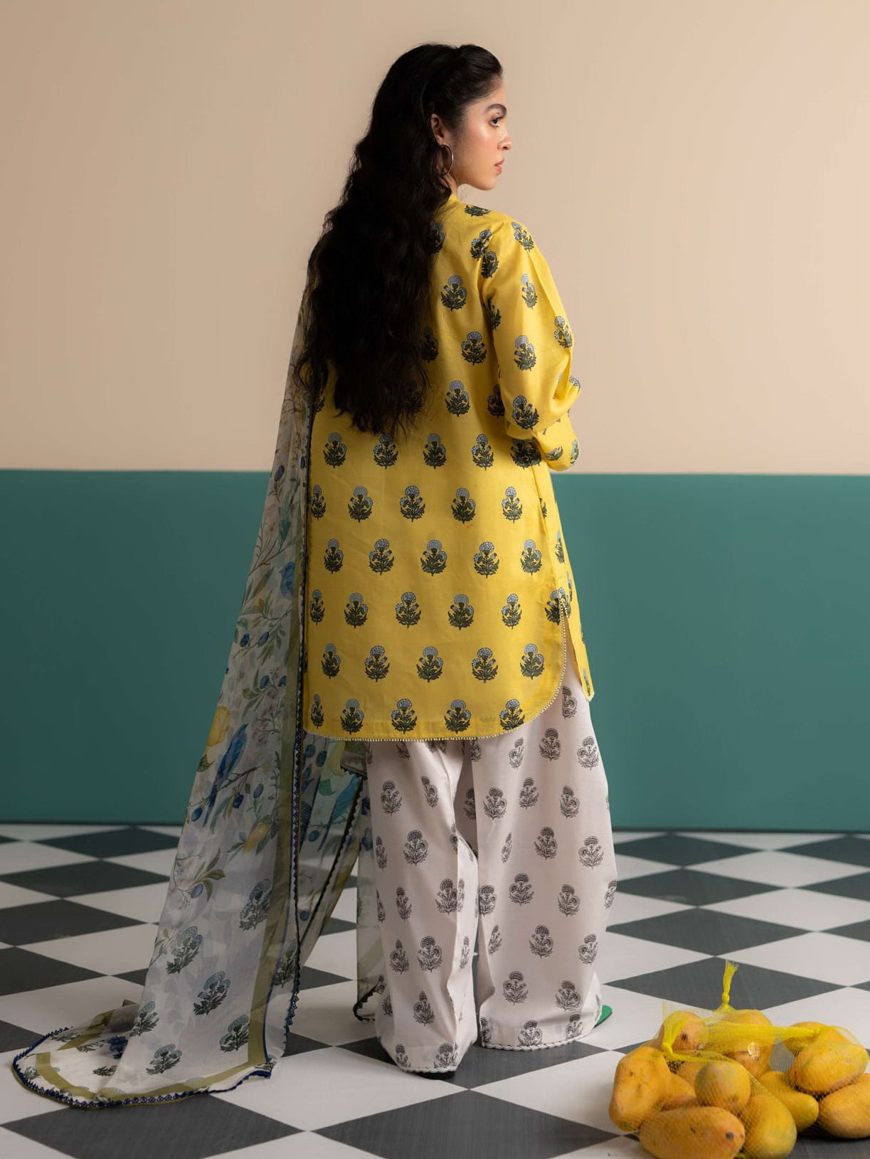 • A sunflower yellow shirt with off-white block printed inspired trouser, paired with a airy chiffon dupatta bright, breezy, and full of charm.