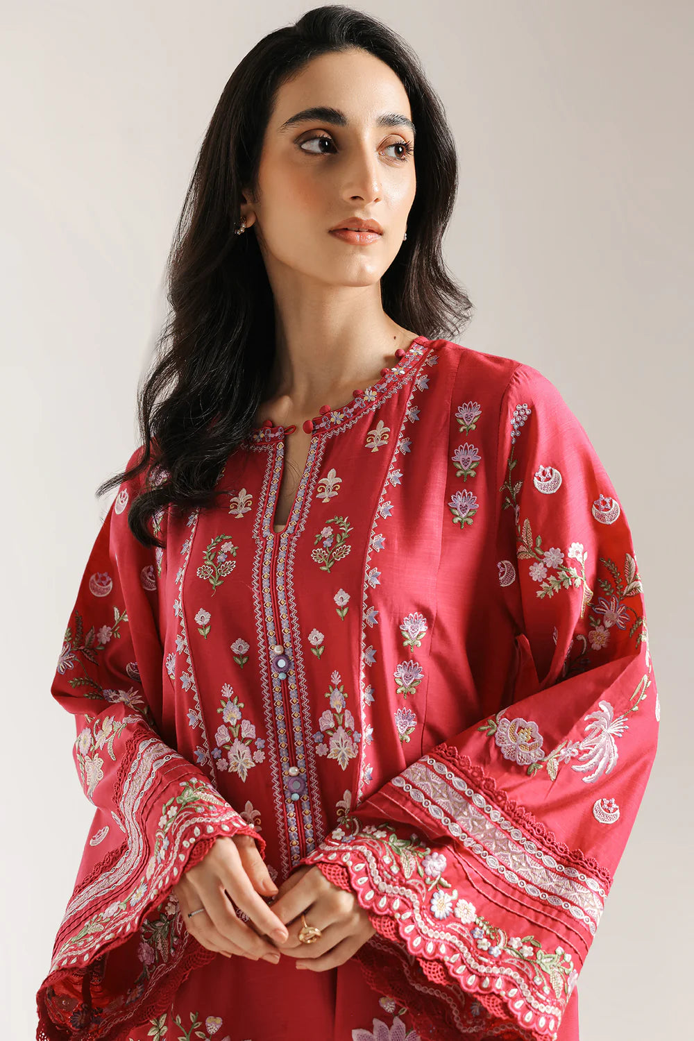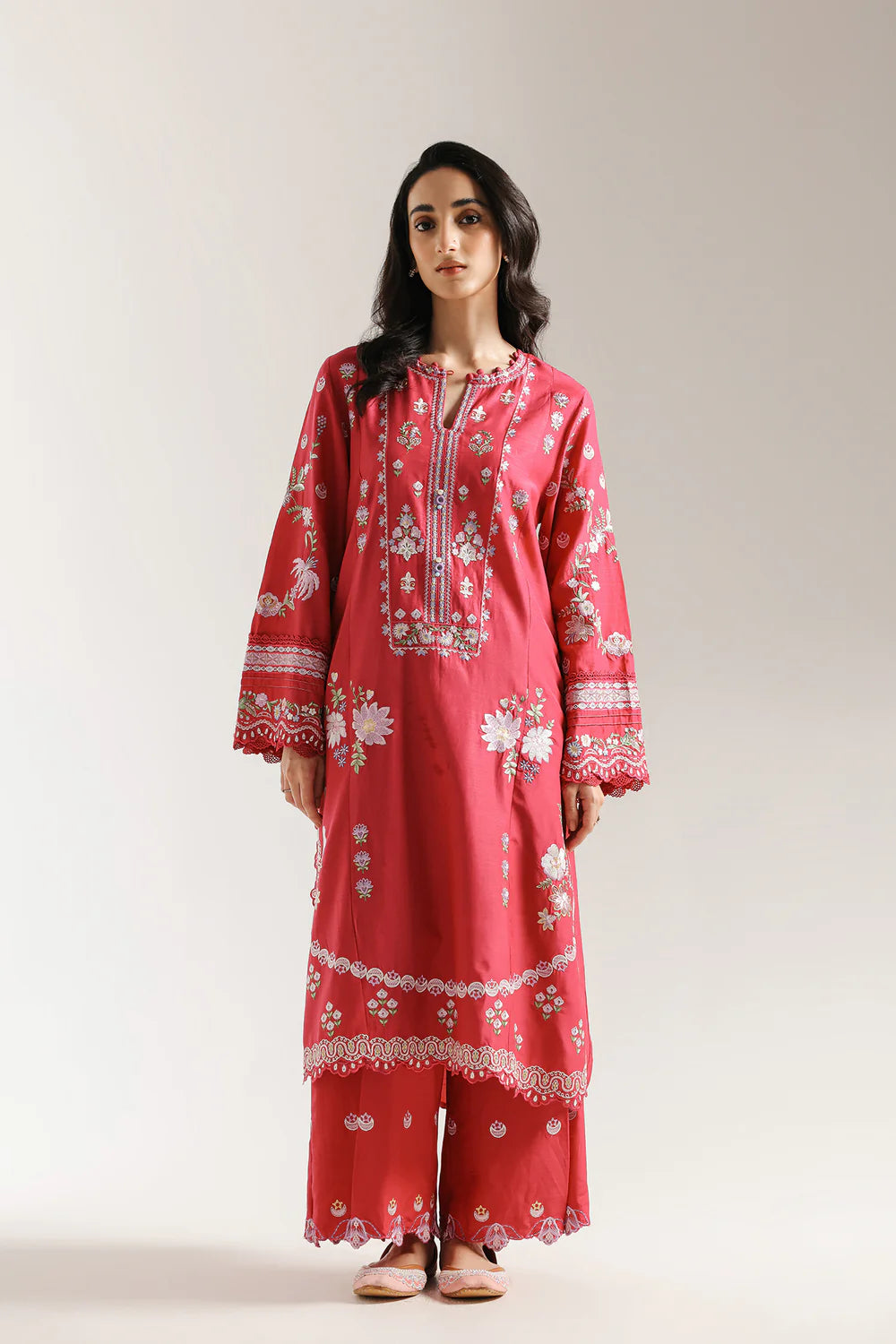 Indulge in the rich elegance of this beautiful embroidered suit. This stunning two-piece ensemble is a work of art, with a vibrant pink base that serves as a beautiful canvas for its intricate designs. The long shirt features elaborate floral and vine embroidery in shades of white, purple, and green, creating a look that is both striking and sophisticated. The suit is completed with matching trousers, making it a perfect choice for any special occasion.
