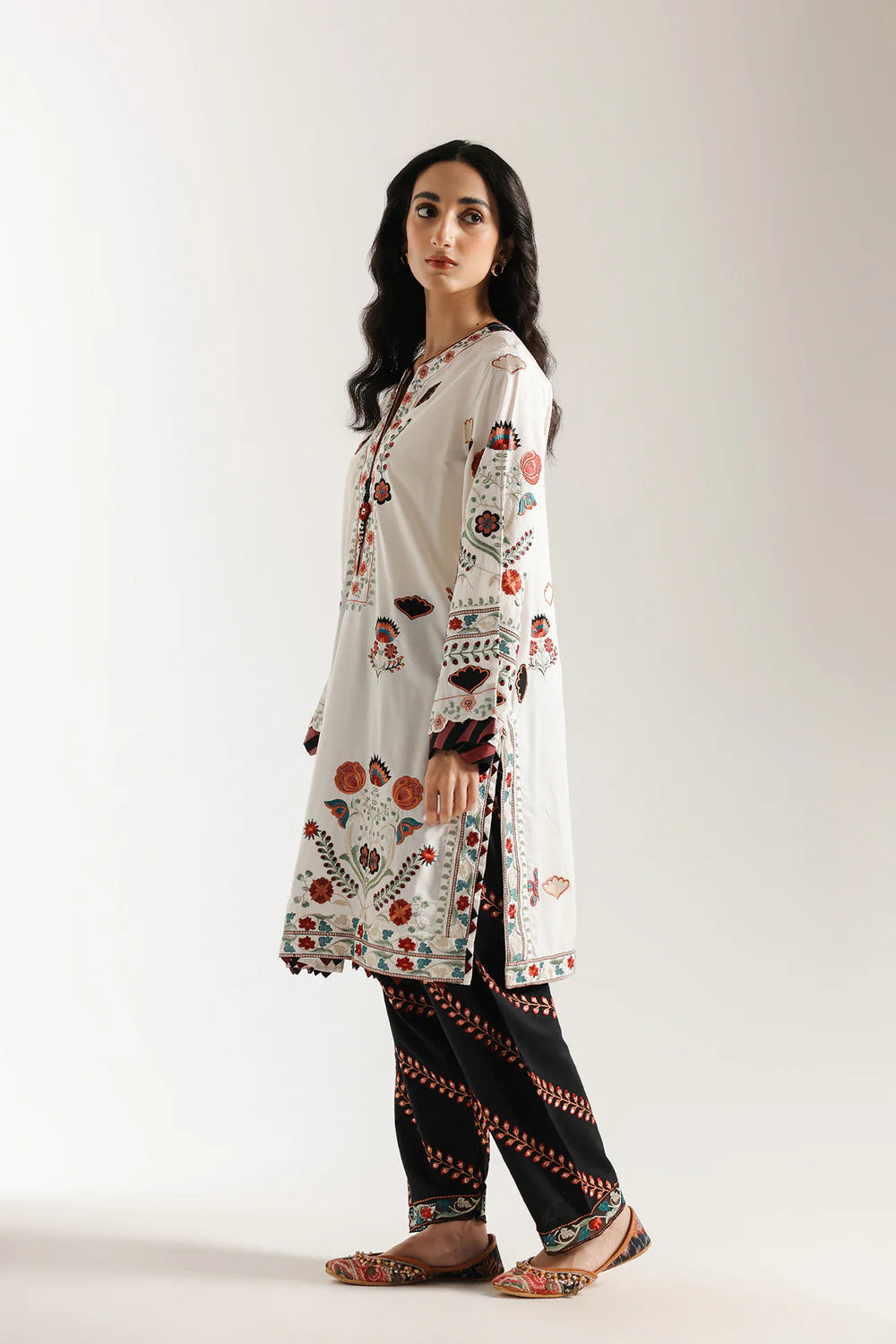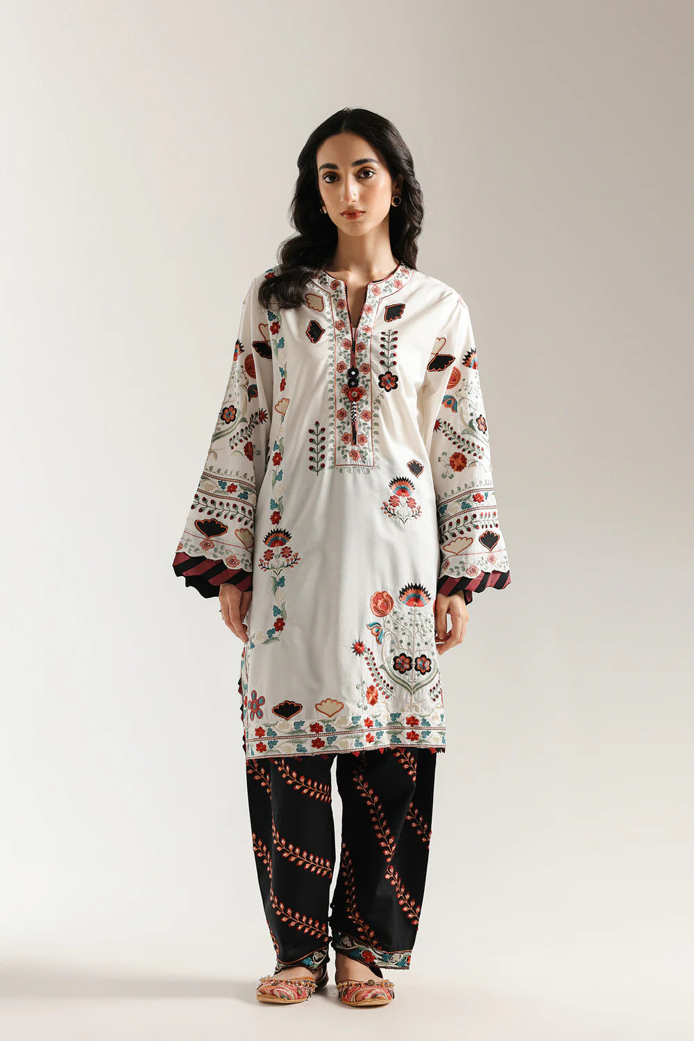 Make a bold statement with this suit that is a celebration of vibrant artistry. This striking two-piece embroidered suit features a clean, white canvas adorned with intricate, colorful floral and geometric patterns. The shirt boasts stunning embroidery in shades of red, black, and blue, creating a mesmerizing design that flows beautifully. The suit is completed with black shalwar that feature a contrasting pattern, adding a unique touch to the ensemble. This elegant and versatile outfit is perfect for both casual gatherings and festive occasions.
