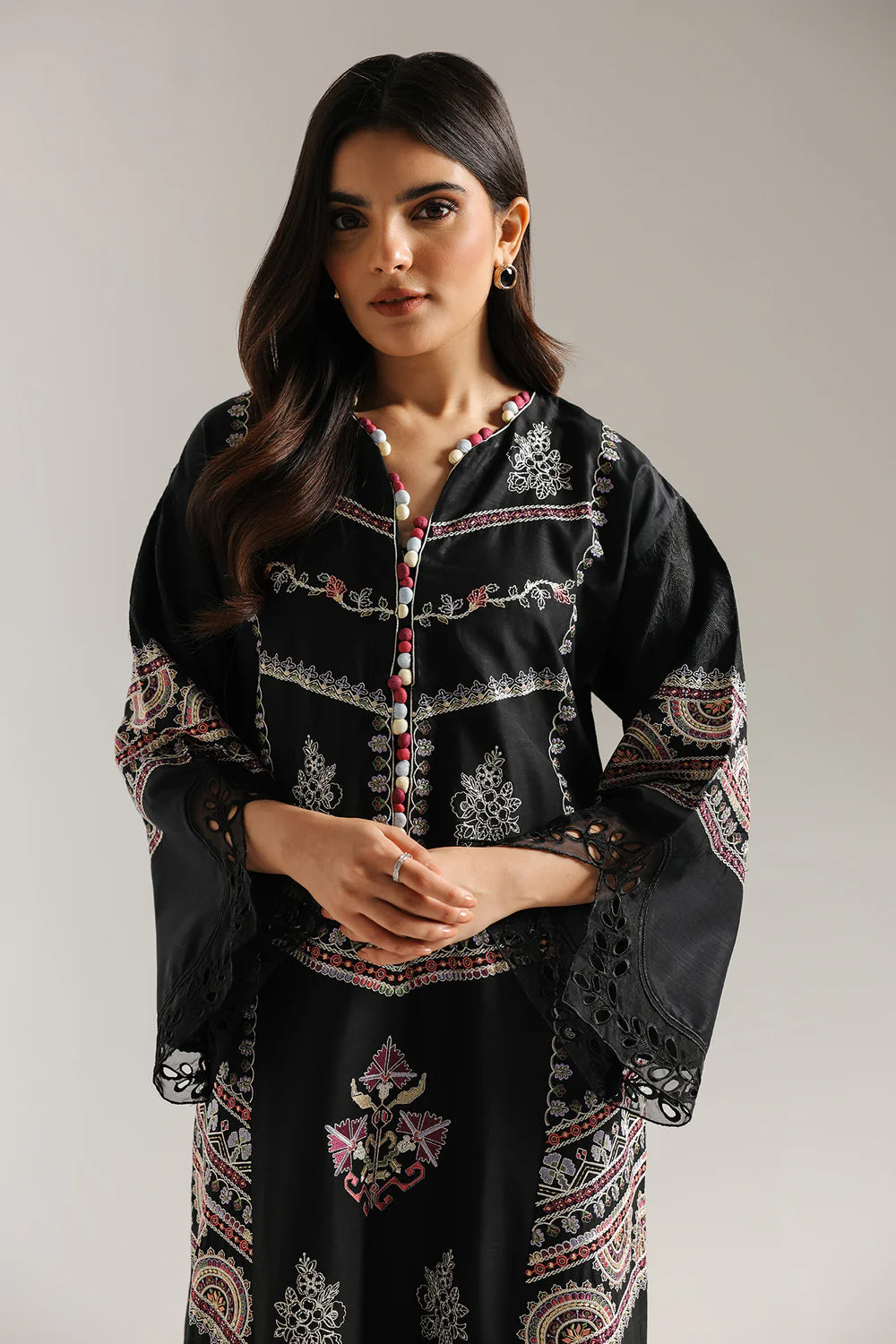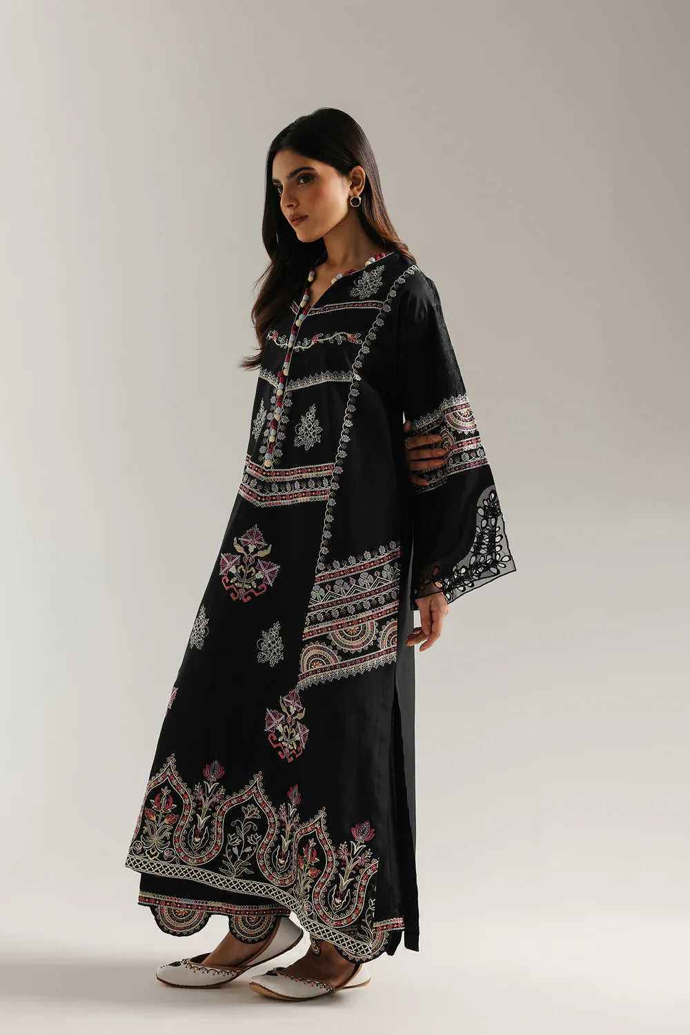 Step out in style with this mesmerizing embroidered suit. This stunning two-piece ensemble is a true masterpiece of craftsmanship. The black base of the long, flowing shirt is a perfect canvas for the intricate and colorful embroidery that adorns the front, sleeves, and hem. The design features a blend of floral and geometric motifs in shades of pink, white, and red, creating a rich and opulent look. The sleeves are finished with delicate lace detailing that adds a graceful and feminine touch. The suit is completed with matching trouser, making it a perfect choice for any special occasion.