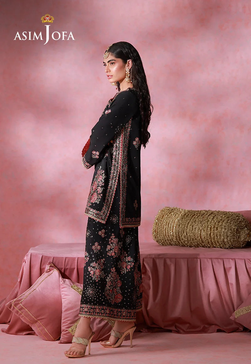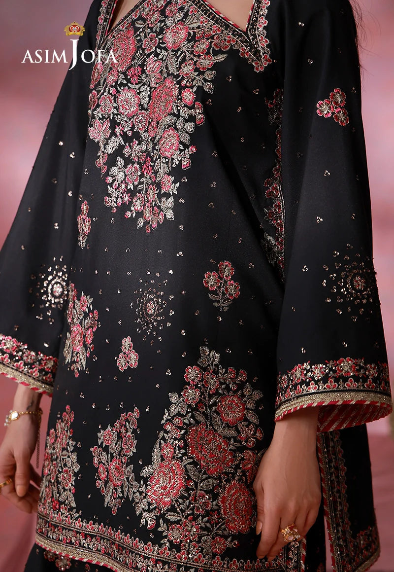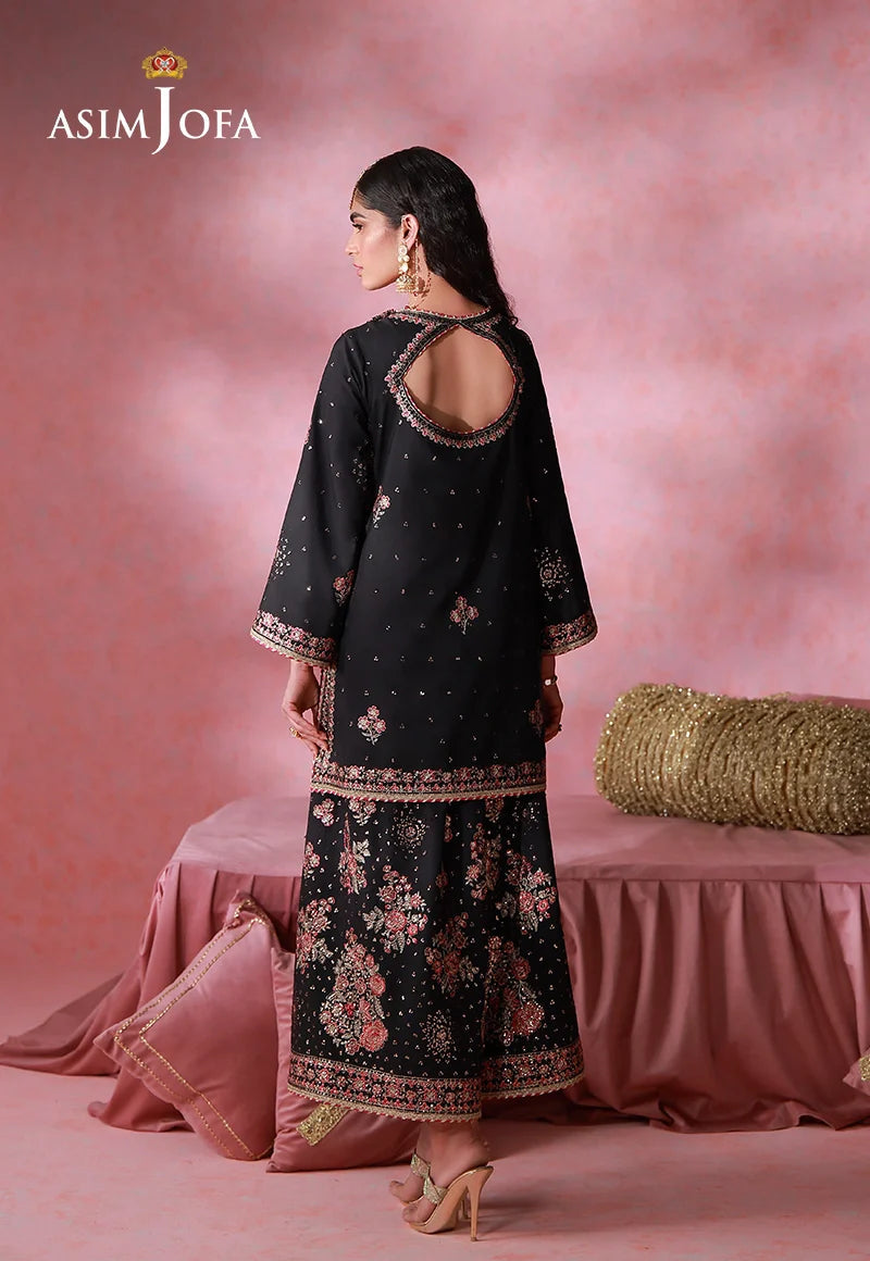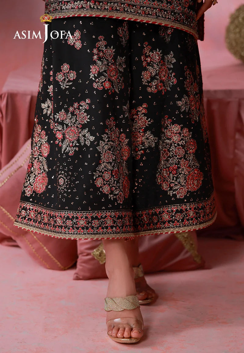 Unveil a design of rare distinction with this black ensemble, where luminous light gold zari and shimmering sequins are beautifully contrasted with warm rust and maroonish-red threadwork. The silk shirt is meticulously embroidered to create a striking balance of richness and refinement. What truly sets this piece apart is its impeccably crafted trousers, lavishly adorned with intricate motifs inspired by a rosy garden kissed by morning dewdrops, lending a poetic depth to the entire look. Every stitch works in harmony to deliver a statement that is both bold and effortlessly stylish, making this ensemble a standout choice for the modern connoisseur.
