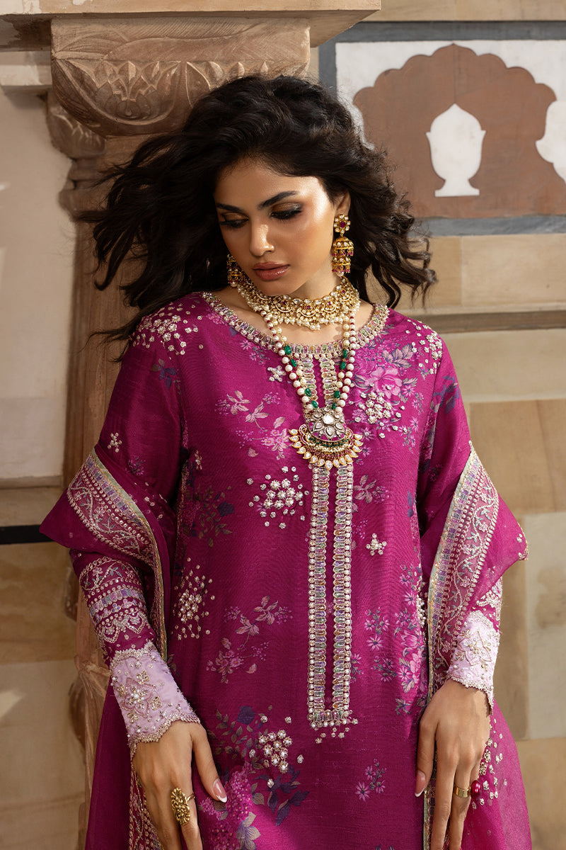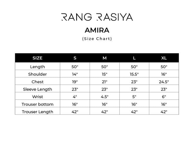 Radiating effortless luxury, Amira combines modern print with exquisite handwork and embellishment, where Swarovski, pearls, naqshi, and tassels glimmer across silk. The intricately crafted chatta patti border and embroidered organza dupatta elevate its festive elegance, a perfect balance of heritage detailing and contemporary allure.
