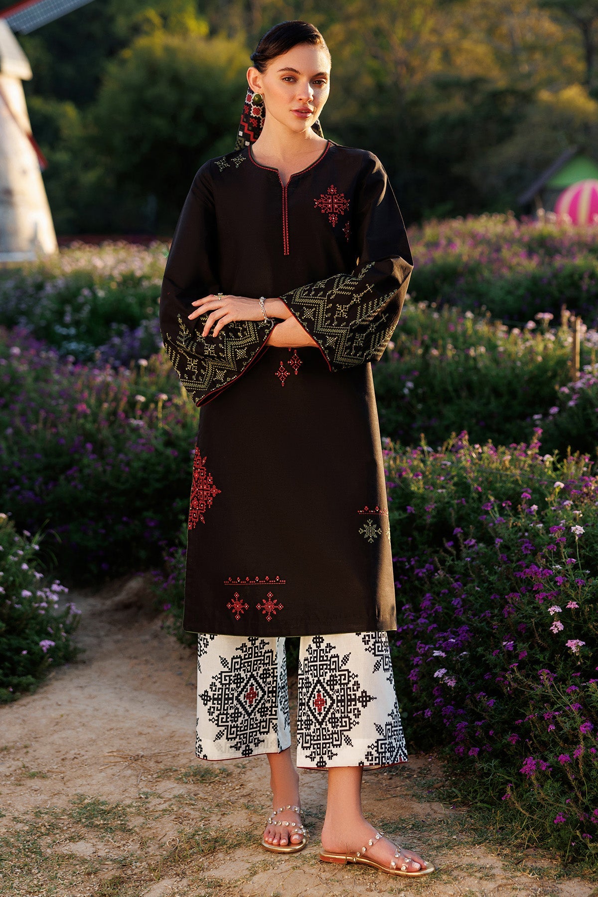 Elevate your wardrobe with this sophisticated three-piece ensemble crafted for refined elegance. The outfit features intricately embroidered lawn on the front and sleeves, showcasing detailed craftsmanship that commands attention. A richly dyed lawn back provides depth and dimension, while the digital printed cambric bottom adds contemporary flair. Completing the set is a stunning tissue silk scarf with digital print detailing, perfect for versatile styling. Ideal for both casual gatherings and formal occasions, this collection merges traditional artistry with modern design sensibilities.