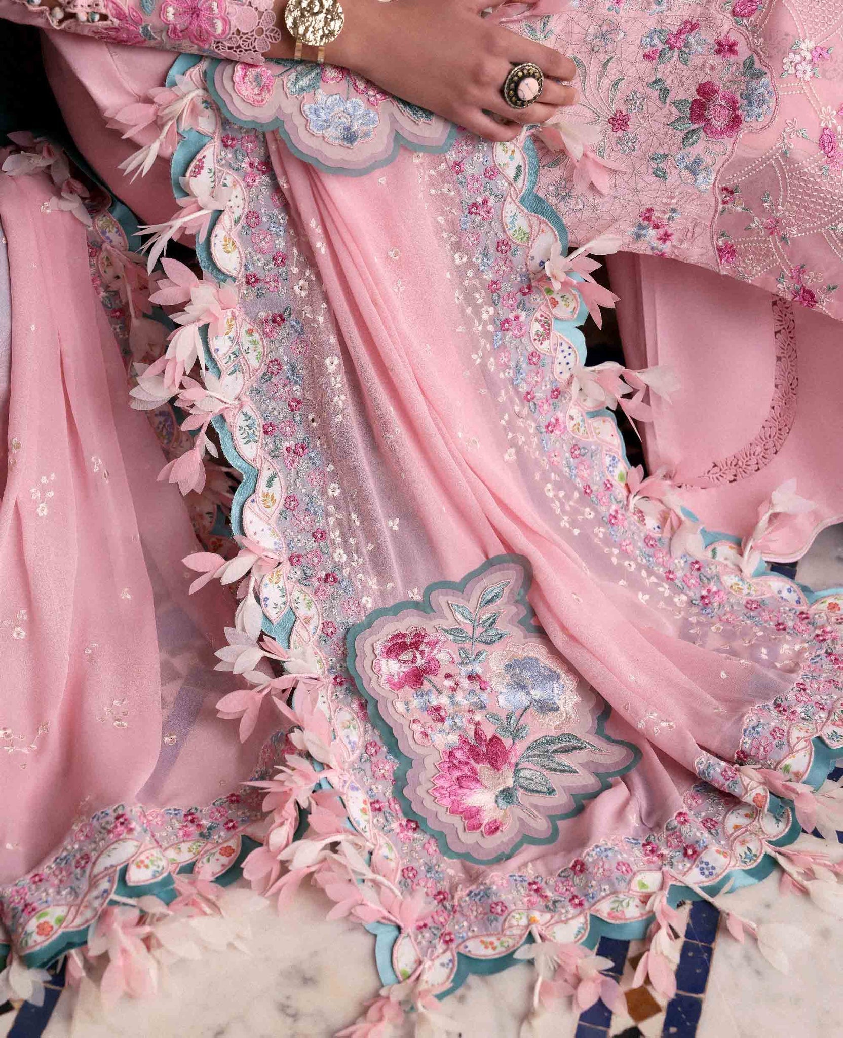 - DESCRIPTION: This three-panel shirt features a refined laser-printed floral composition in soft pinks, vibrant greens, and serene blues set against a crisp white base, creating a cool and breezy daytime look. The sleeves are delicately detailed with a boring technique and a slit-open finish, elevated with a translucent organza border. The hemline is completed with a graceful botanical border that ties the design together beautifully. Paired with a lightweight chiffon dupatta, finished with continuous florals and handcrafted organza bunches. An effortlessly graceful choice for Eid gatherings, light, polished, and timeless.