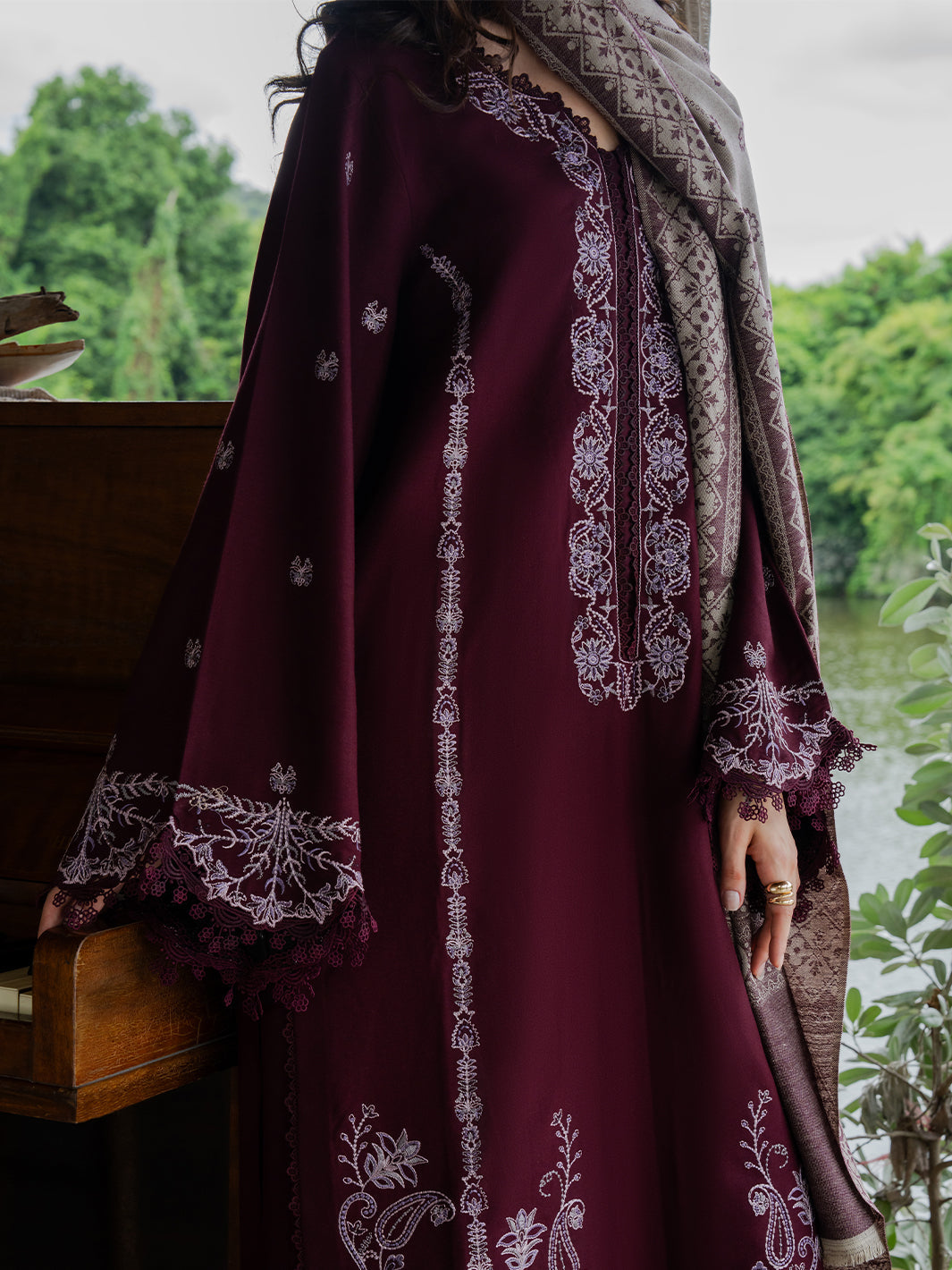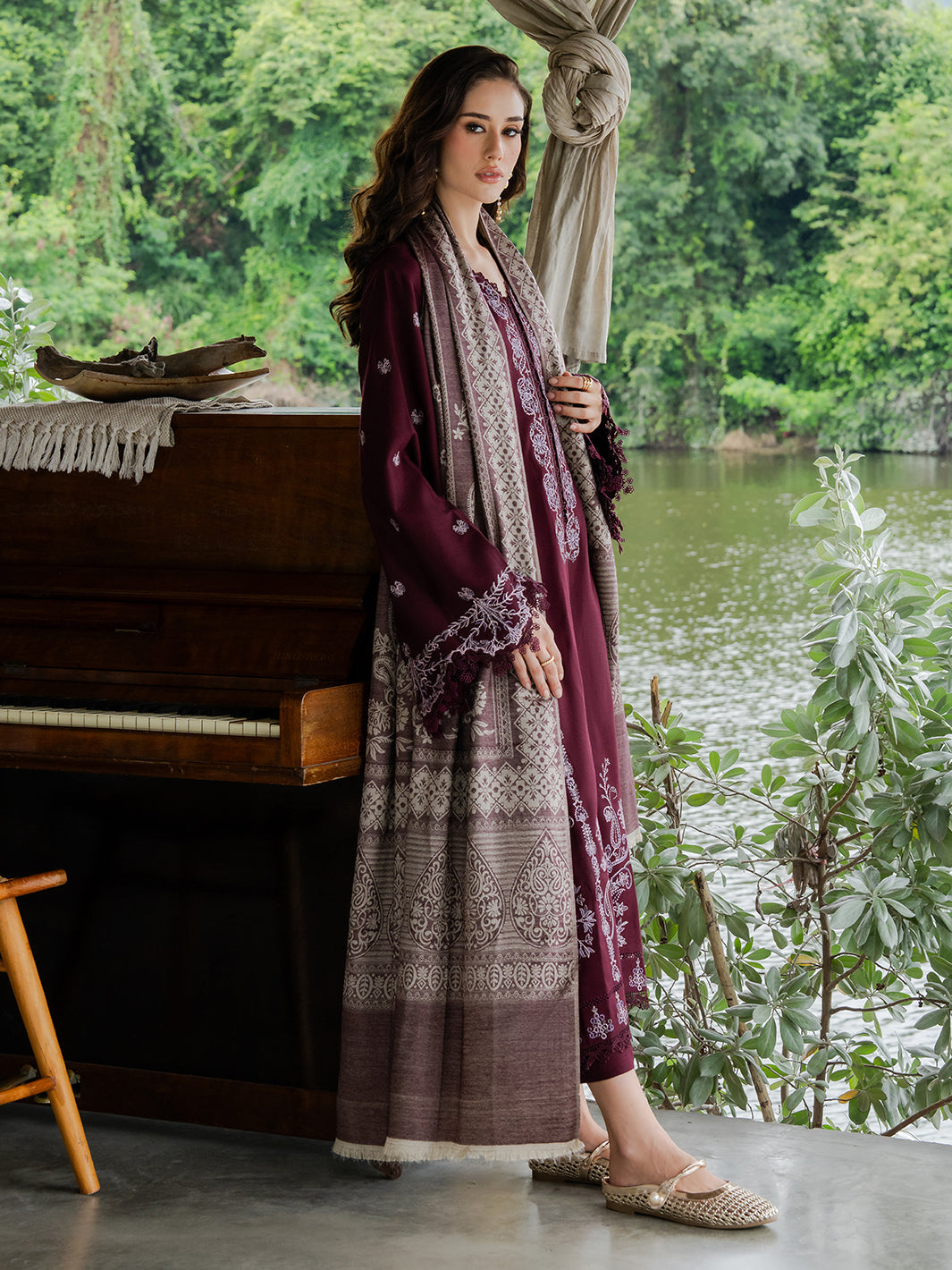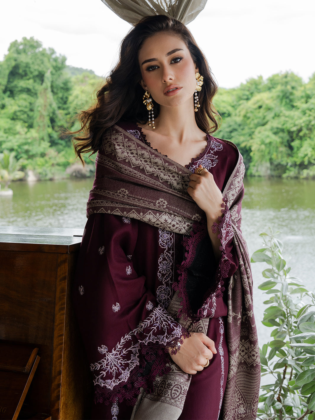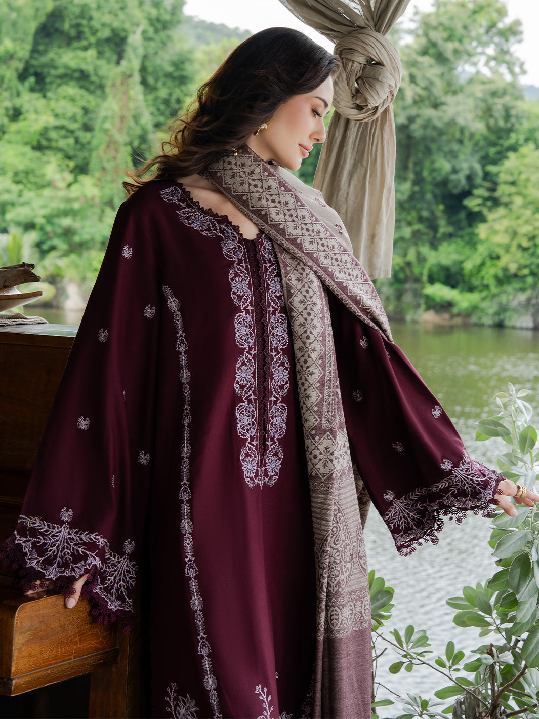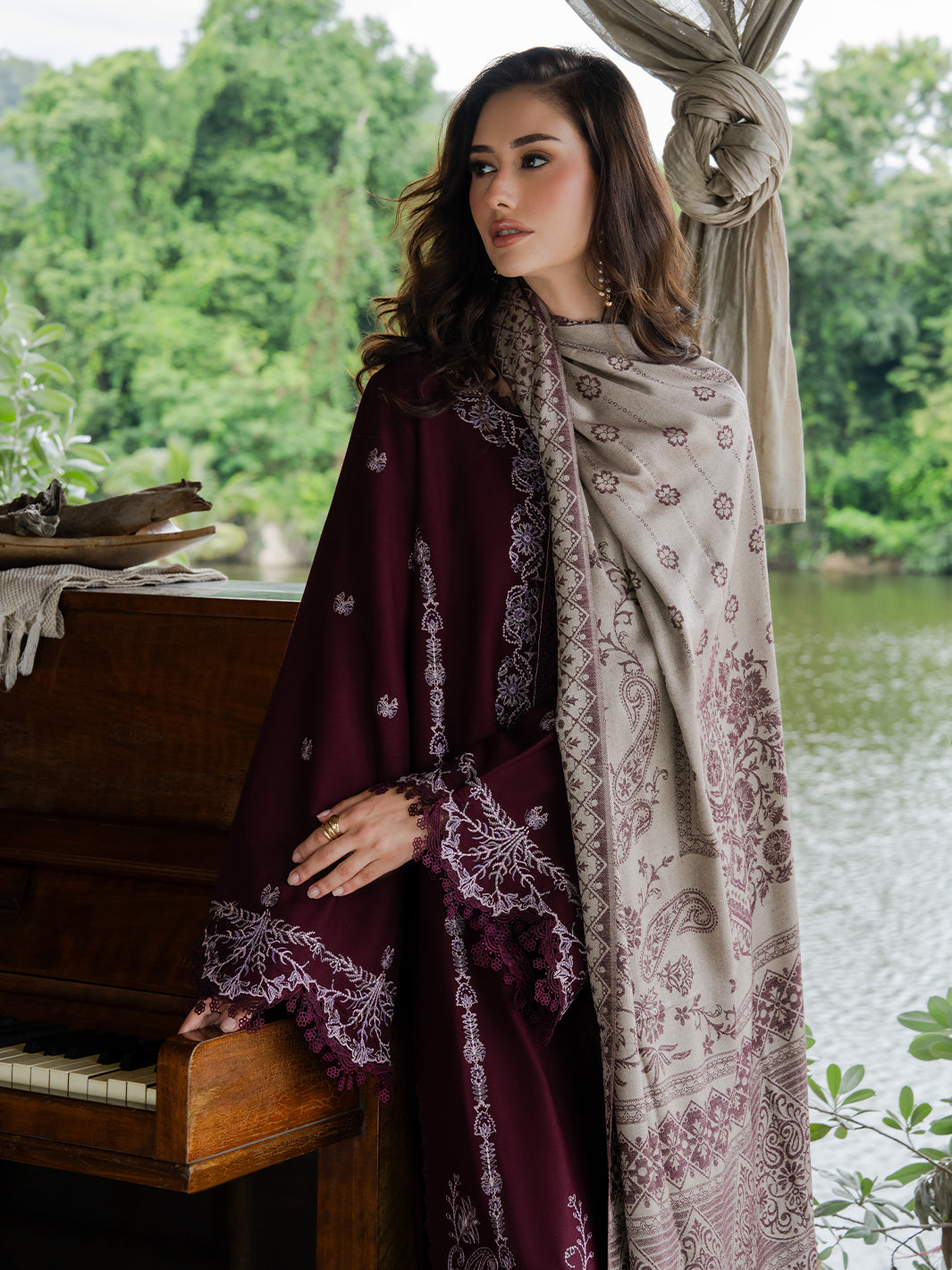 Willa is a masterpiece creation in premium soft Italian wool. It enchants with intricate embroidery along the neckline, sleeves, and hem. Paired with a jacquard shawl in earthy tones and plain woolen trousers, it is the perfect harmony of regal elegance and winter warmth.
