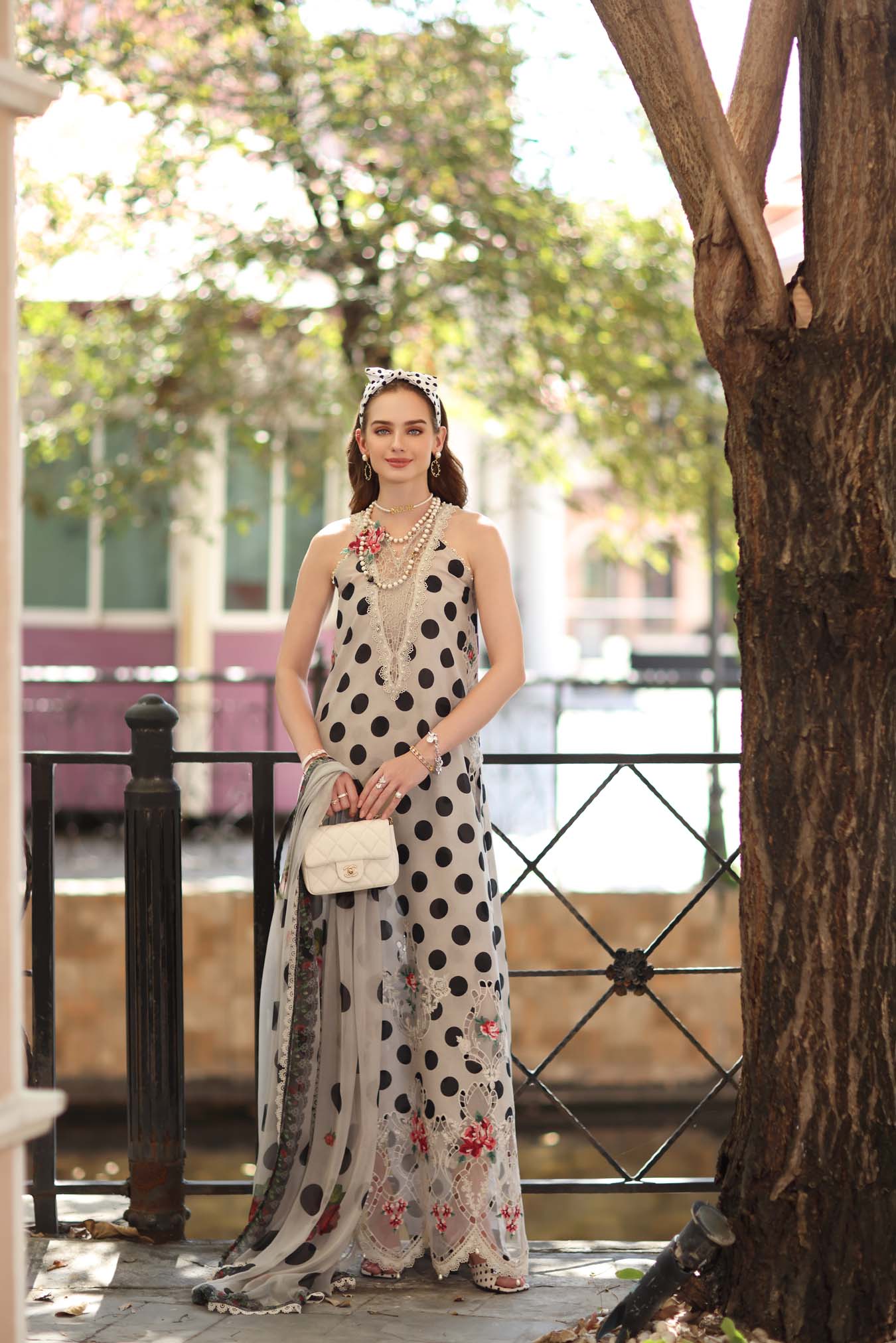 Step into effortless elegance with this statement ensemble, adorned with bold noir polka dots that exude vintage charm with a modern luxe twist. The shirt features a soft moonlight grey base enhanced with striking black polka prints, creating a refined monochrome aesthetic. Delicate floral embroideries in subtle hues bloom along the hem, adding a graceful touch of femininity. Intricate lace finishing and detailed borders elevate the overall look, giving it a polished Eid ready feel. Paired with beautifully coordinated trousers, the ensemble maintains balance between minimalism and festive flair. The airy printed dupatta, adorned with complementary detailing and elegant borders, flows effortlessly, completing the look with poise and charm.