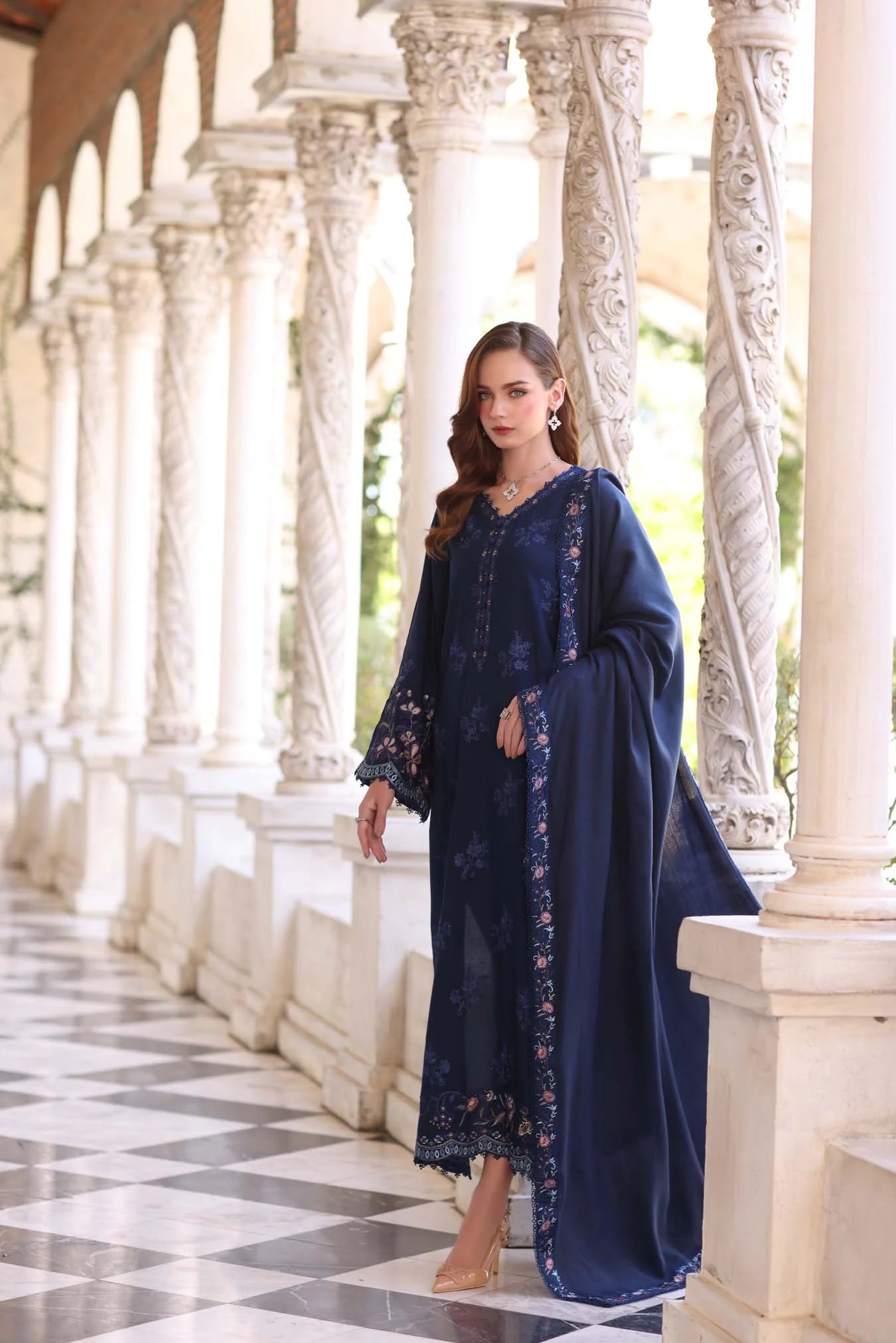 A deep blue winter ensemble that captures the essence of timeless elegance. The shirt features self-colored embroidery, creating a refined tone-on-tone texture, while multi-hued gara borders add a captivating burst of artistry and color. Paired with a luxurious pashmina shawl, finished with four sided delicate borders, the look embodies the perfect harmony of tradition and sophistication.