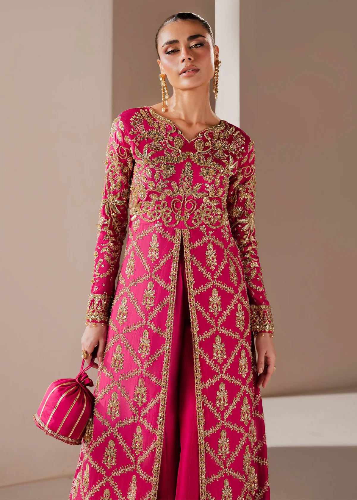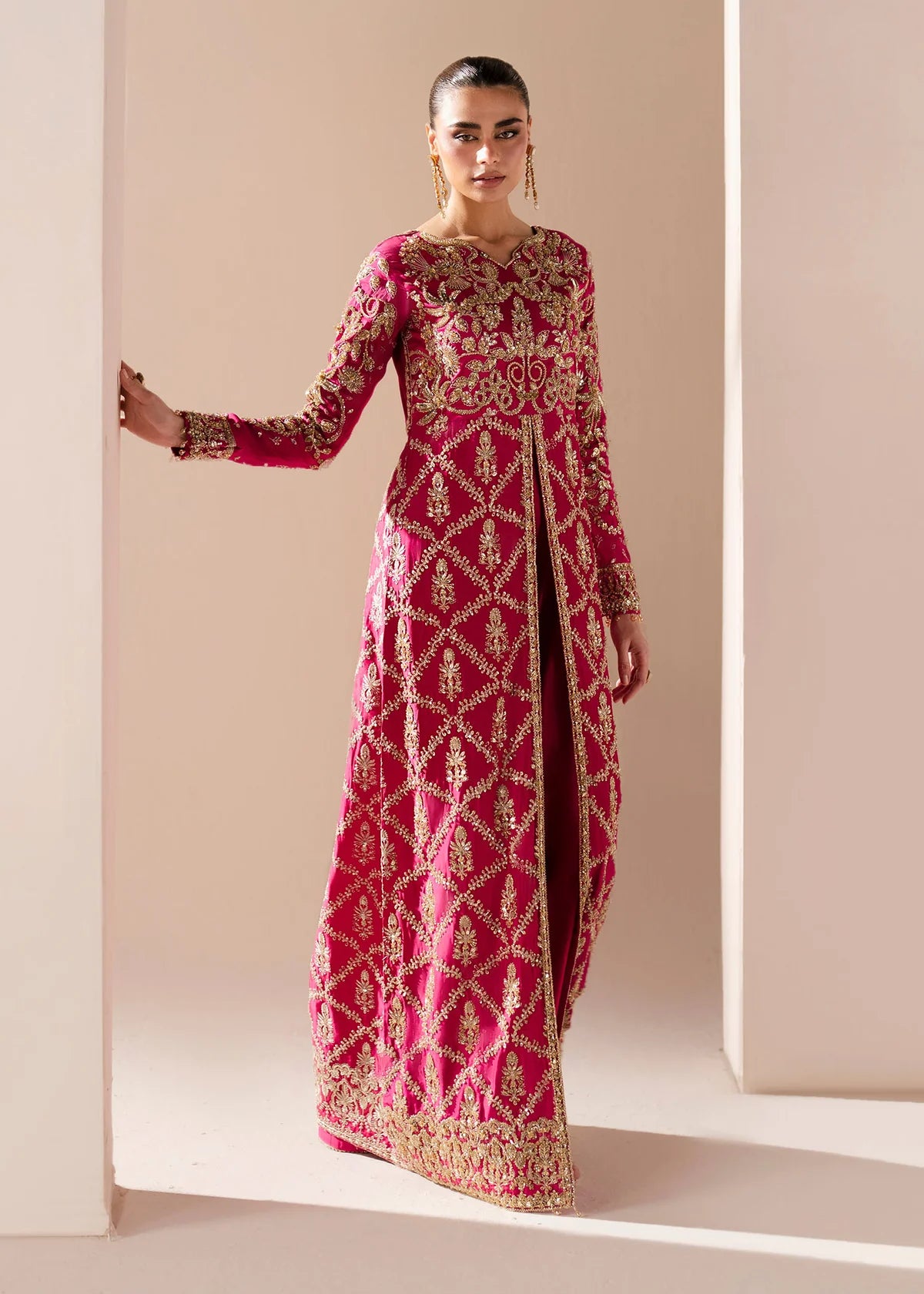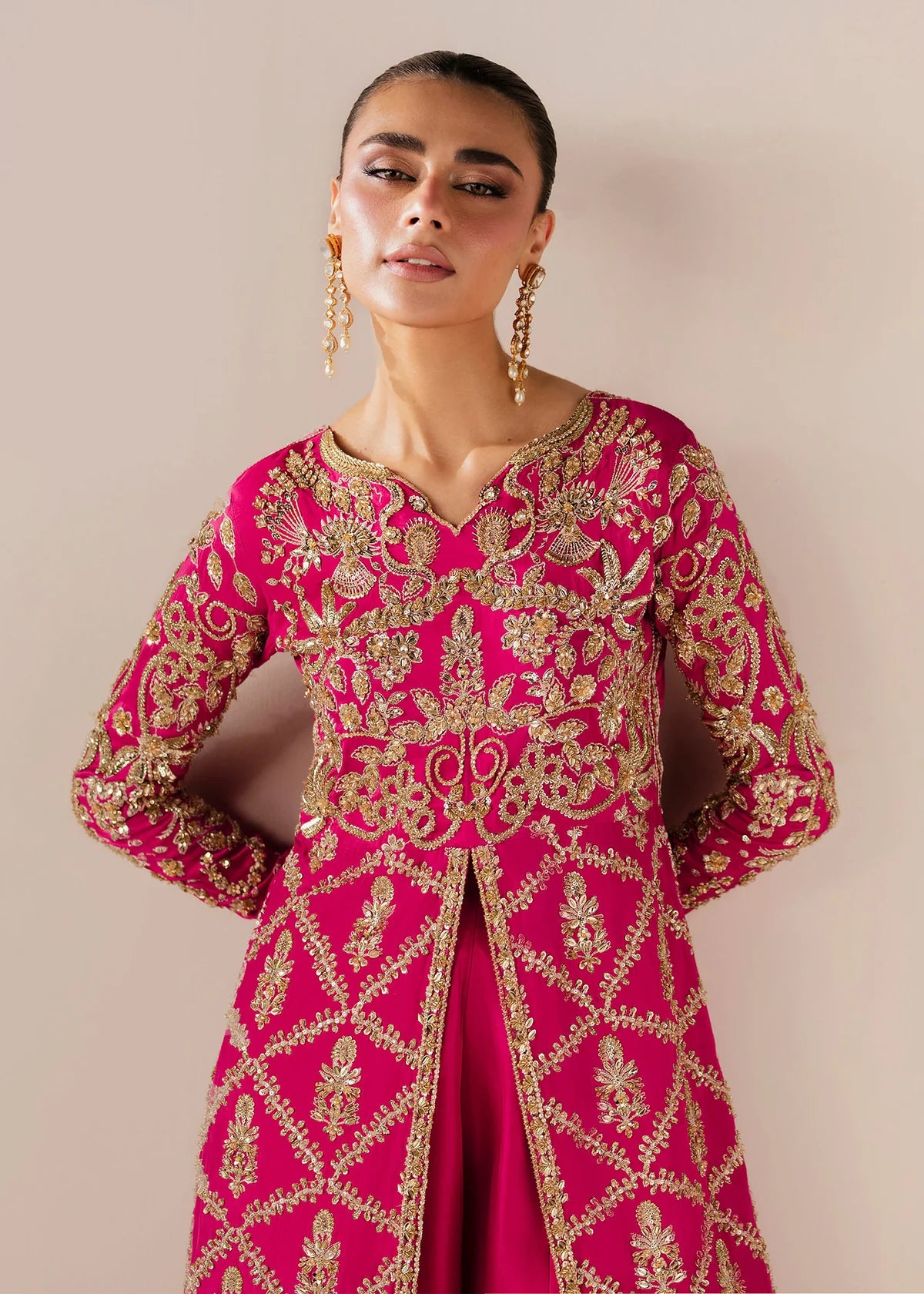 Description: Radiating confidence and allure in every glimmer, this fuchsia gown is a vision of modern opulence. The front-open slit beneath the bodice adds a touch of bold femininity, while intricate embellishments of crystals and Swarovski stones illuminate its rich hue. Paired with pure silk sharara pants, it’s where grandeur meets irresistible grace.