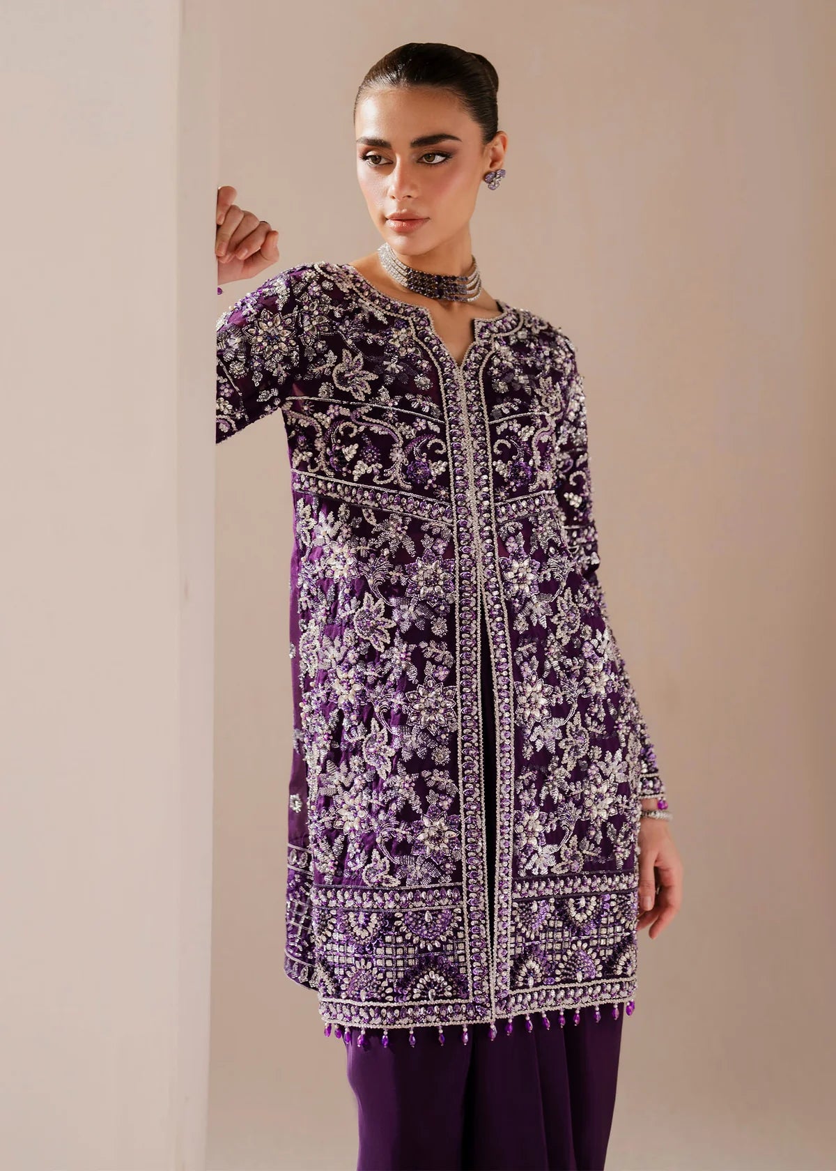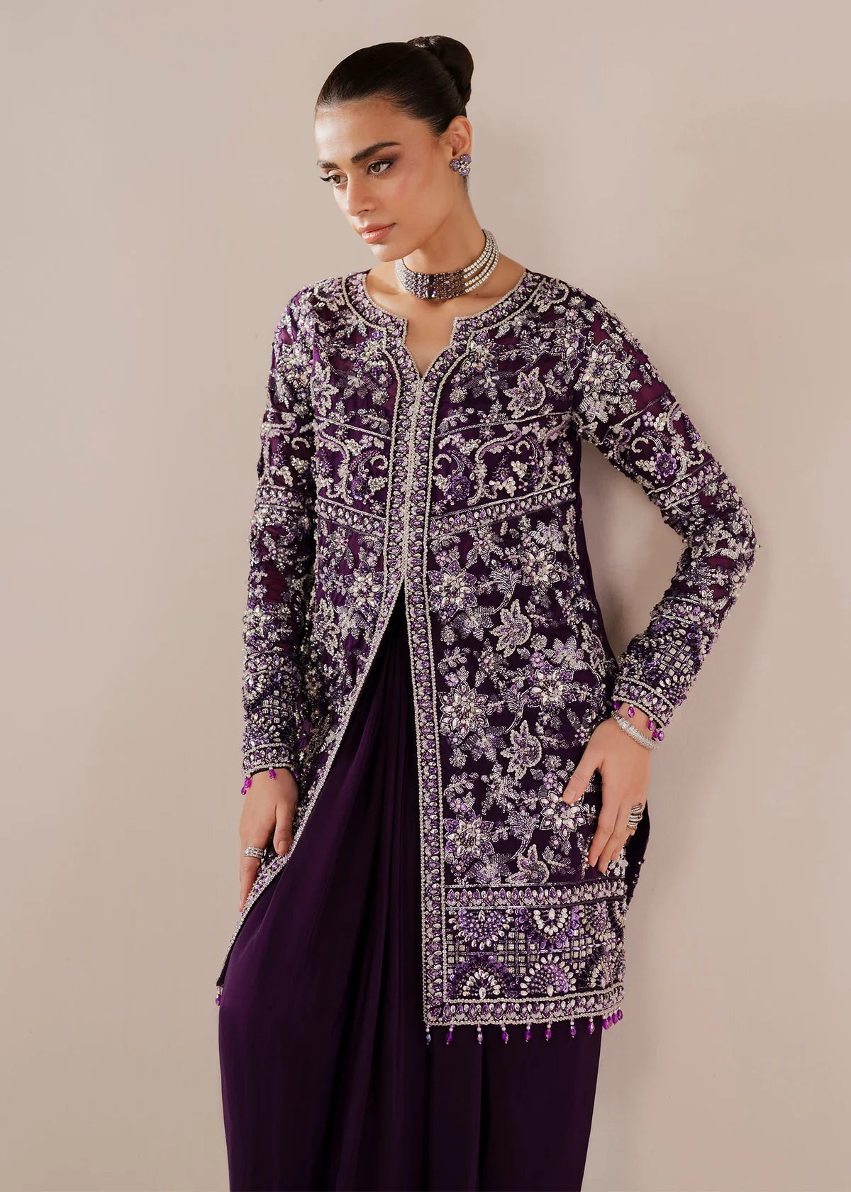 Description: Deep enchanting purple that feels like dusk captured in fabric. It draws you in quietly, then holds you there. Aysel mirrors that allure with its front-open short shirt and fluid draped skirt, brought to life through intricate hand embellishments of crystals, pearls, Swarovski, and fine stones. Every detail is placed with intention, creating a soft shimmer that moves with grace. It’s elegance without effort the kind that speaks softly, but stays with you!