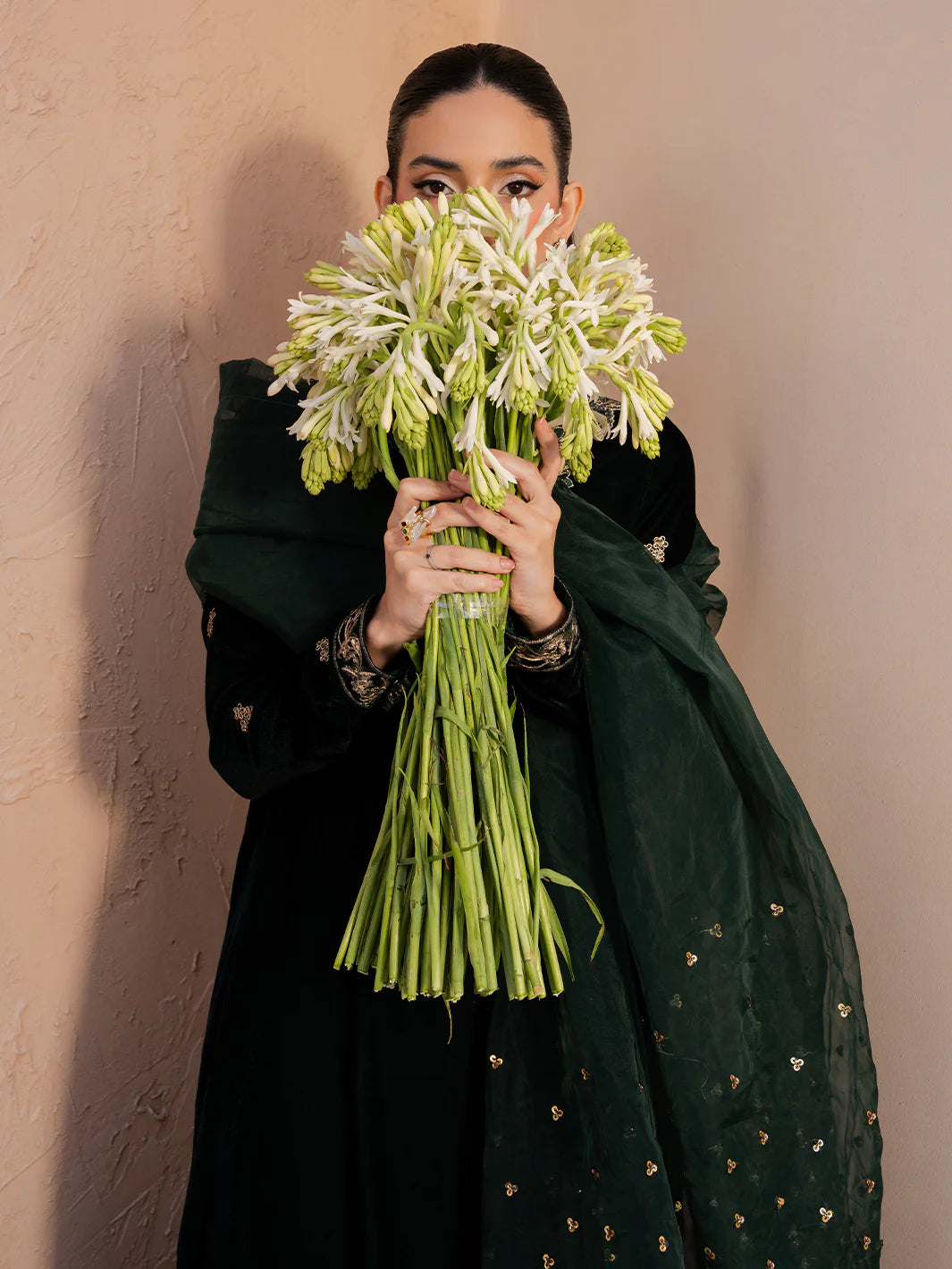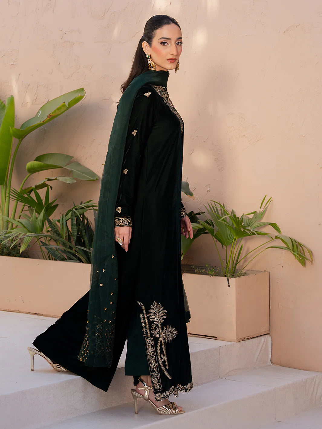 Solene from the Le Tresor Collection embodies timeless sophistication. The ensemble features an embroidered velvet front and sleeves complemented by an embroidered organza neckline patch and intricate front damn border. A plain velvet back and plain raw silk trousers provide subtle balance while the embroidered organza dupatta completes the look with a touch of refined elegance perfect for festive and special occasions