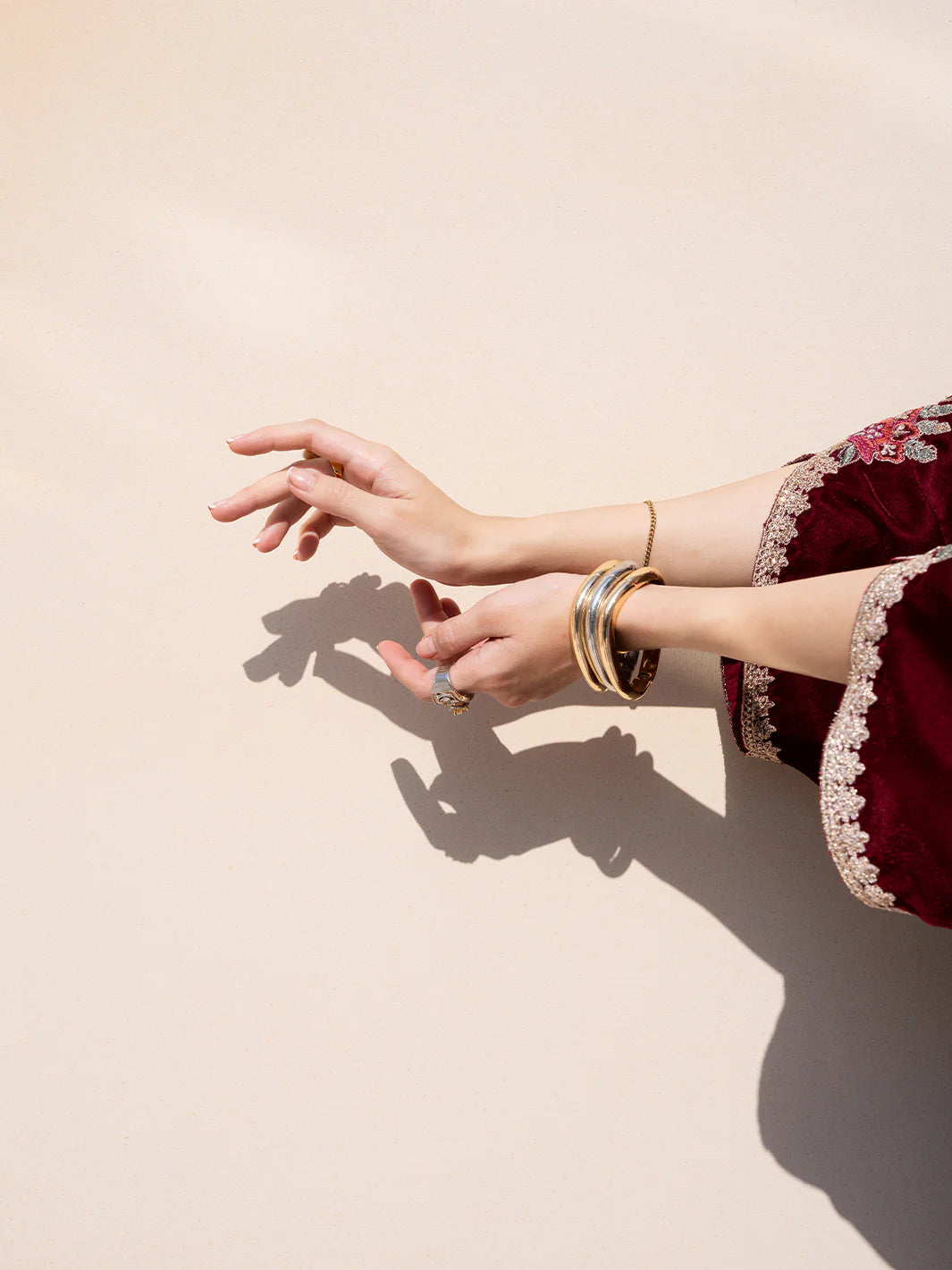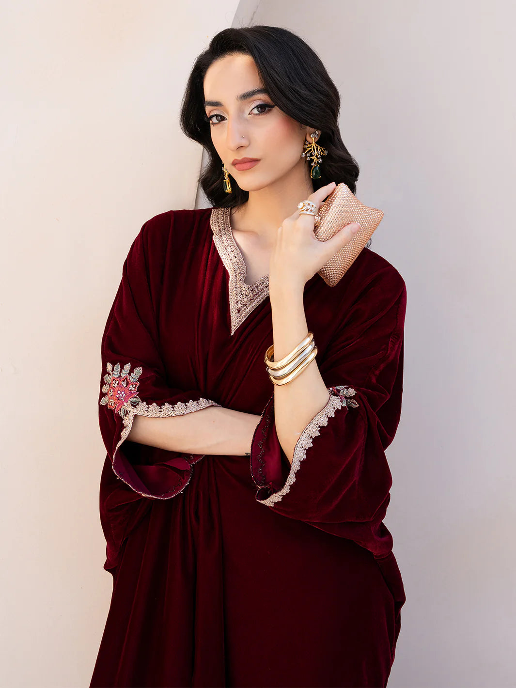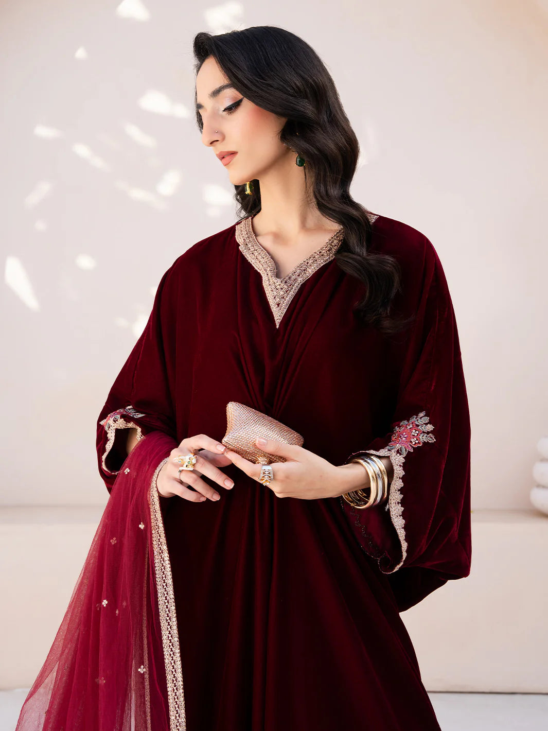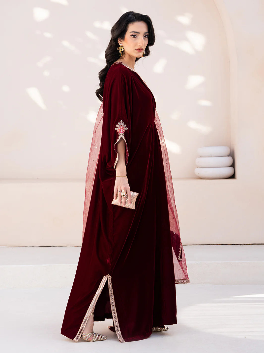 Merlot from the Le Tresor Collection exudes graceful sophistication featuring a plain velvet front back and sleeves the ensemble is enhanced with embroidered organza detailing on the neckline sleeves and slit patti. Plain raw silk pants provide a subtle balance while the embroidered net dupatta adds a delicate finishing touch merlot combines understated elegance with refined craftsmanship