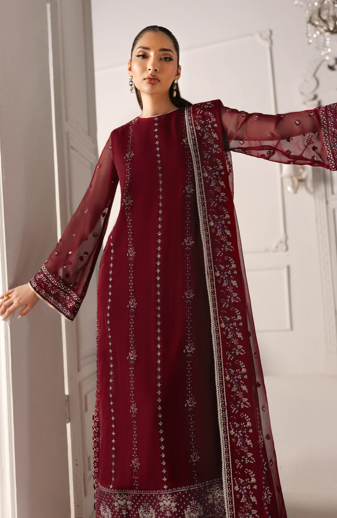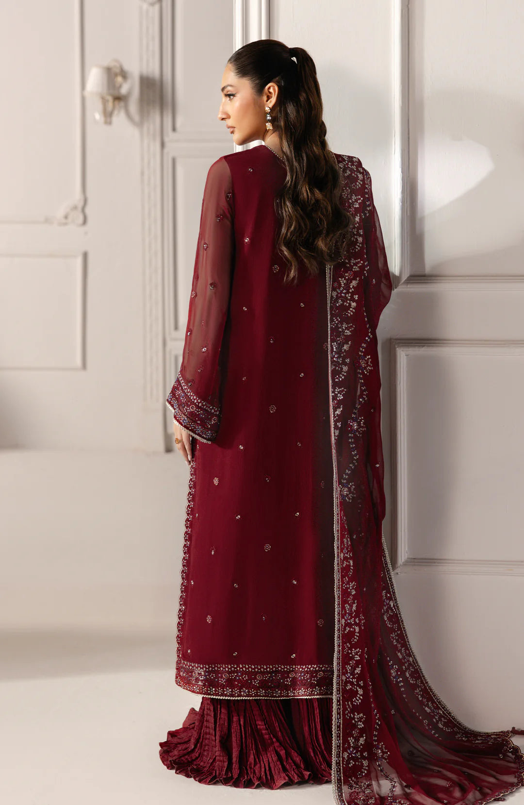 The Rosaline ensemble, unstitched and mesmerizing, features intricate embroidery across the front and back, with a delicately embroidered chiffon dupatta. The rich red hue, paired with a raw silk dyed pants, evokes a sense of regal elegance. With its fringed hem adding a bold statement, this outfit is perfect for those who seek to shine with grace and sophistication on their special moments.