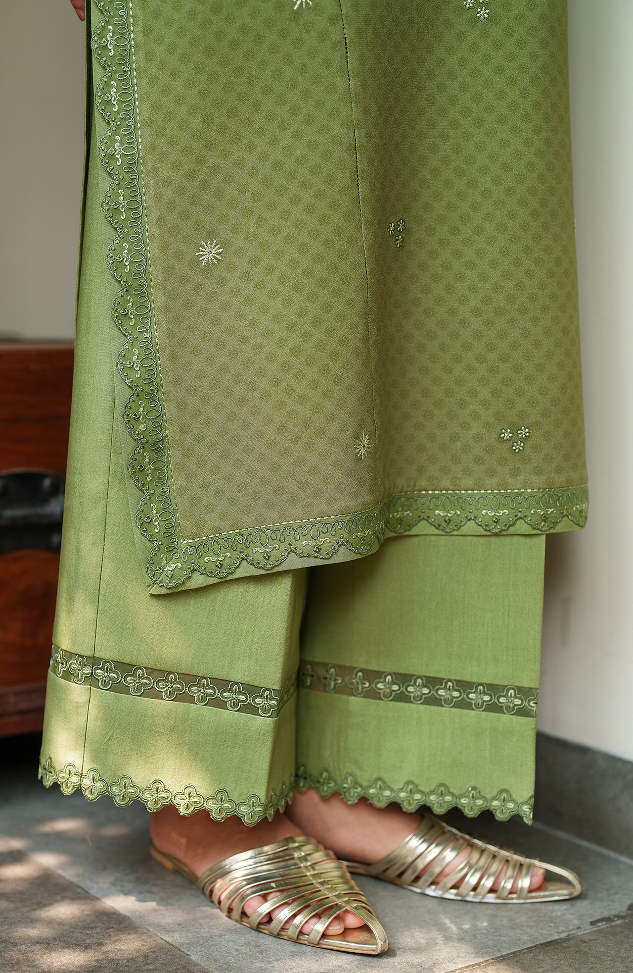 Fresh, graceful, and refined — Olirae embodies understated elegance in a refreshing olive green hue. Crafted from plain viscose, the shirt features delicate embroidery along the neckline and sleeves, with subtle floral threadwork that elevates its minimalist charm. Paired with matching trousers adorned with embroidered lace detailing at the hem, this look is completed with a striking printed blended shawl dupatta in deep navy, blooming with intricate floral and paisley patterns, a perfect contrast that enhances the ensemble’s sophistication.