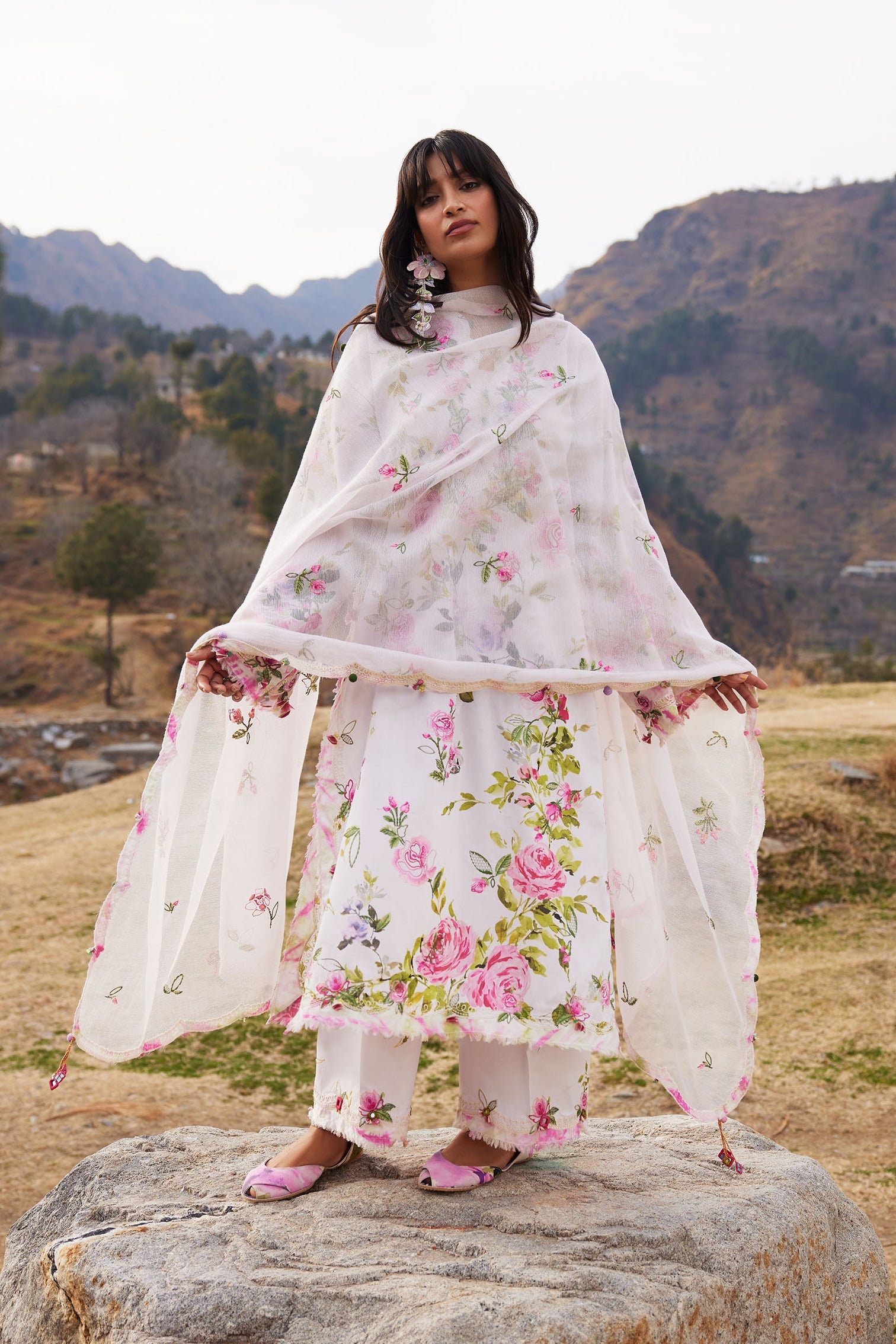 A textured cotton net dupatta, adorned with embroidered floral motifs, completes the ensemble with ethereal charm. Light as air yet beautifully composed, it drapes like a veil of lilac mist—romantic, luminous, and endlessly feminine.