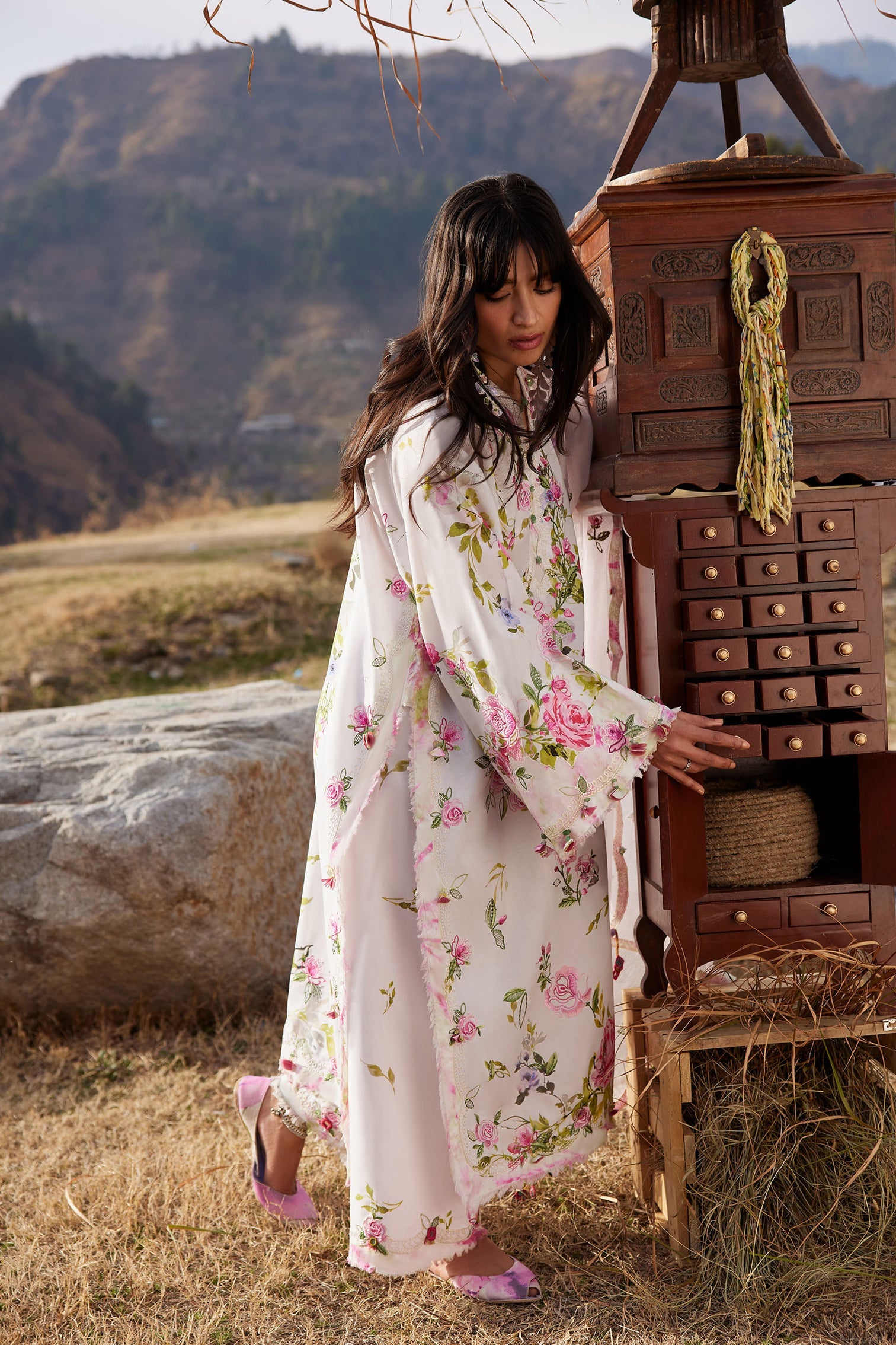 The flowing silhouette, paired with coordinated printed trousers, creates an effortlessly elongated form that moves with poetic ease.