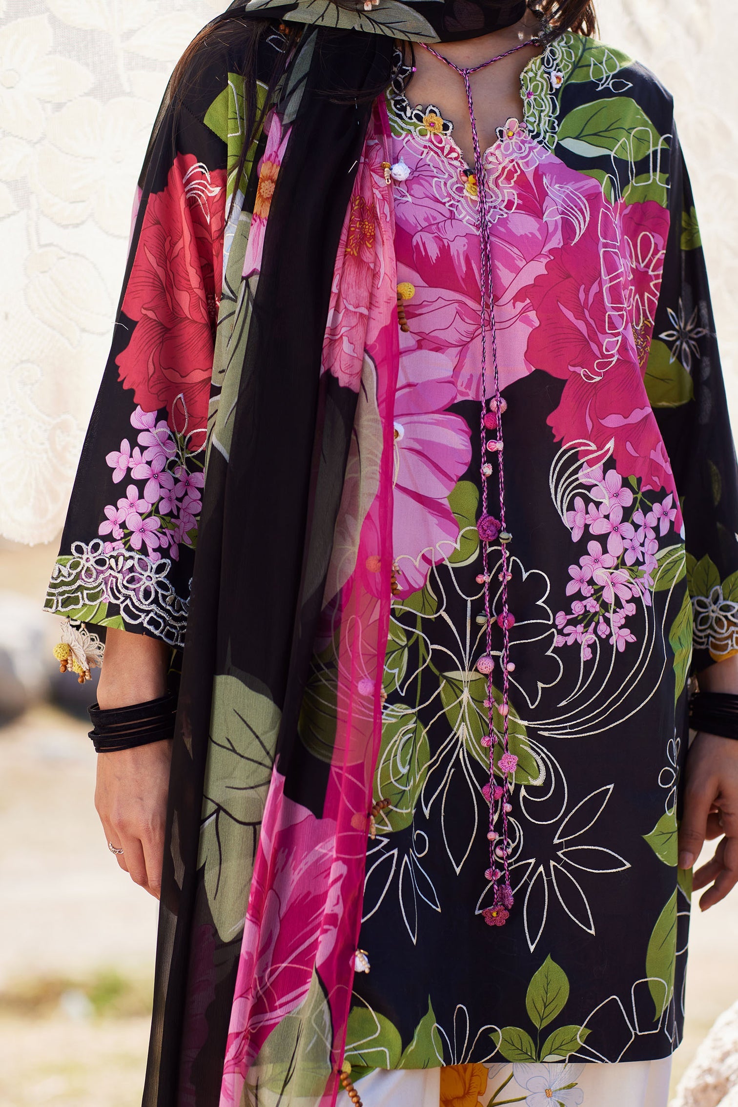 Finished with a lightweight chiffon dupatta, sheer and fluid in movement, the ensemble balances bold intensity with effortless grace.