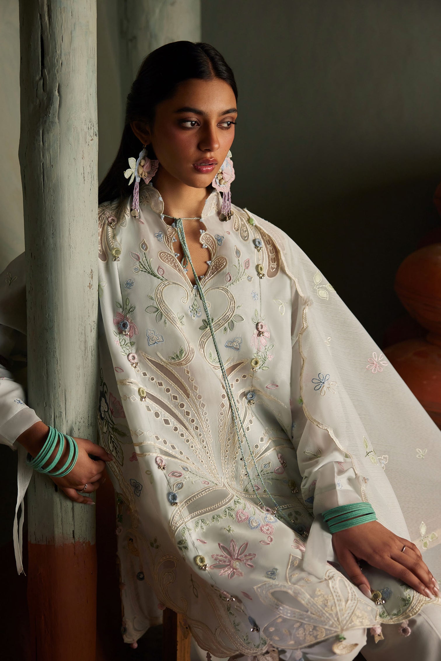 A vision of ethereal elegance, this soft pastel blue ensemble is adorned with floral and botanical embroidery in blush, lilac, mint, and ivory. Paired with straight-cut trousers and a woven checkered organza cotton net dupatta, the look flows with airy grace — balancing delicate artistry with serene sophistication