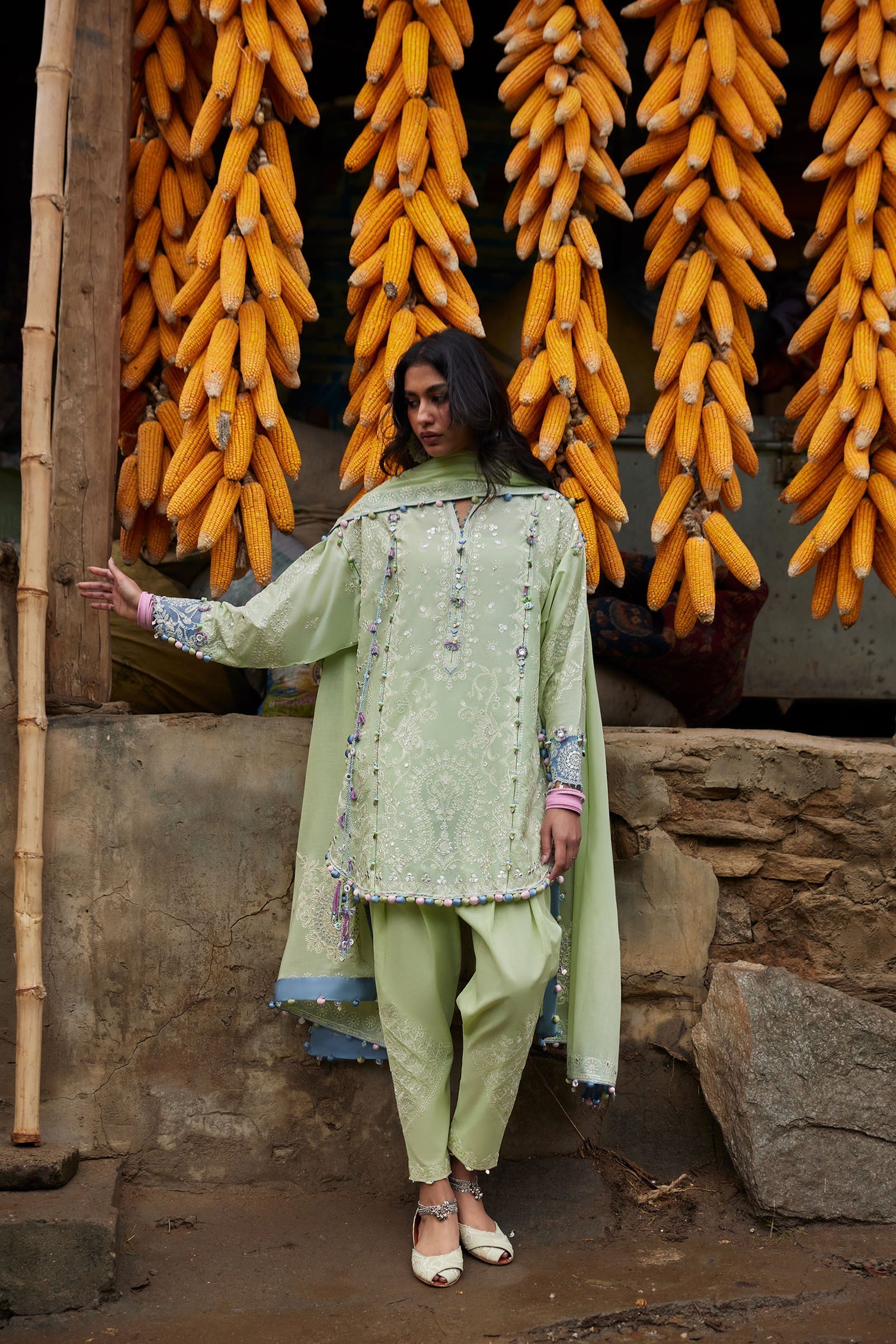Paired with a woven checkered cotton net dupatta, the look floats with airy elegance, sheer, weightless, and refined. Yùlù is a study in serene opulence, fresh as dawn, composed as jade, and effortlessly radiant.