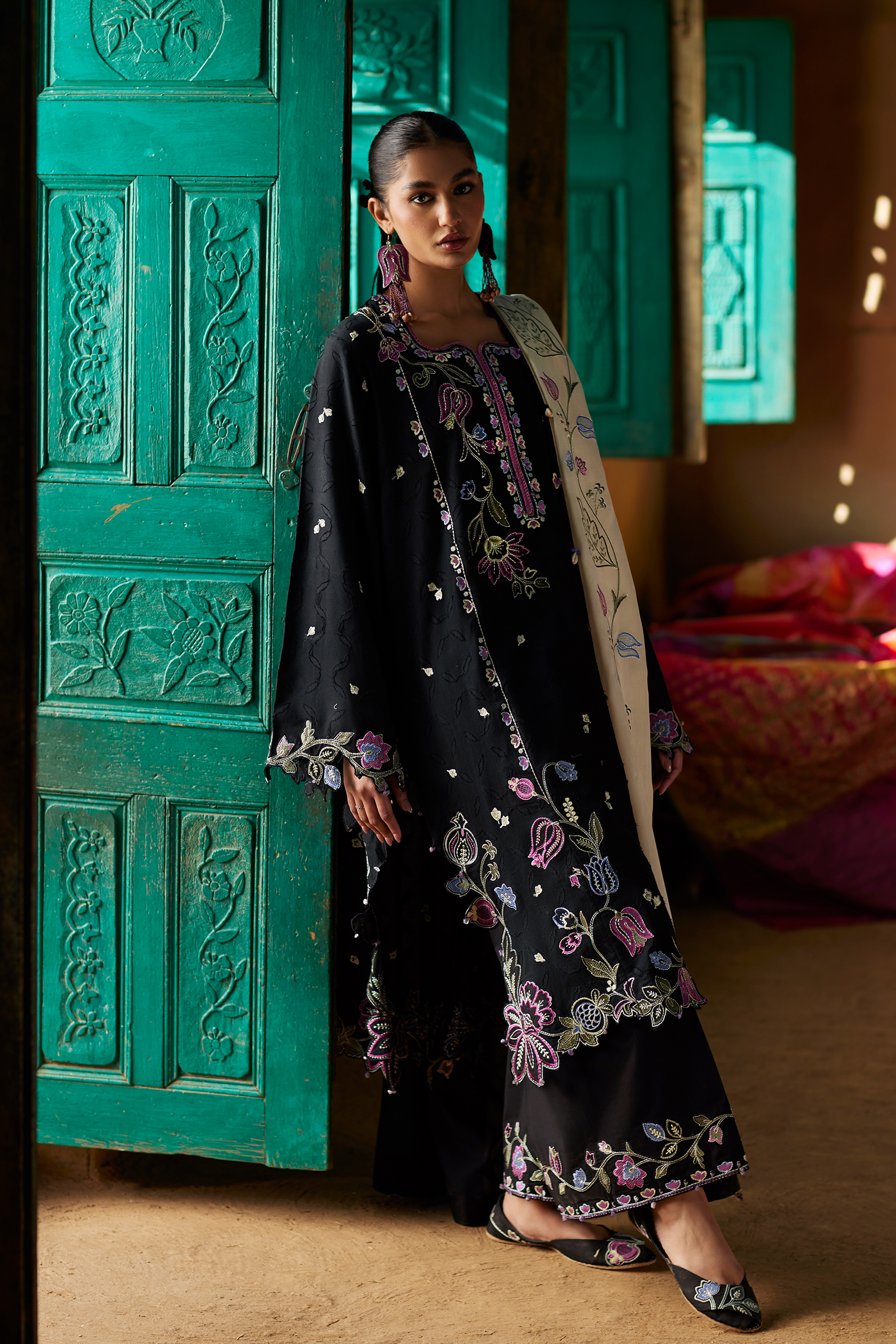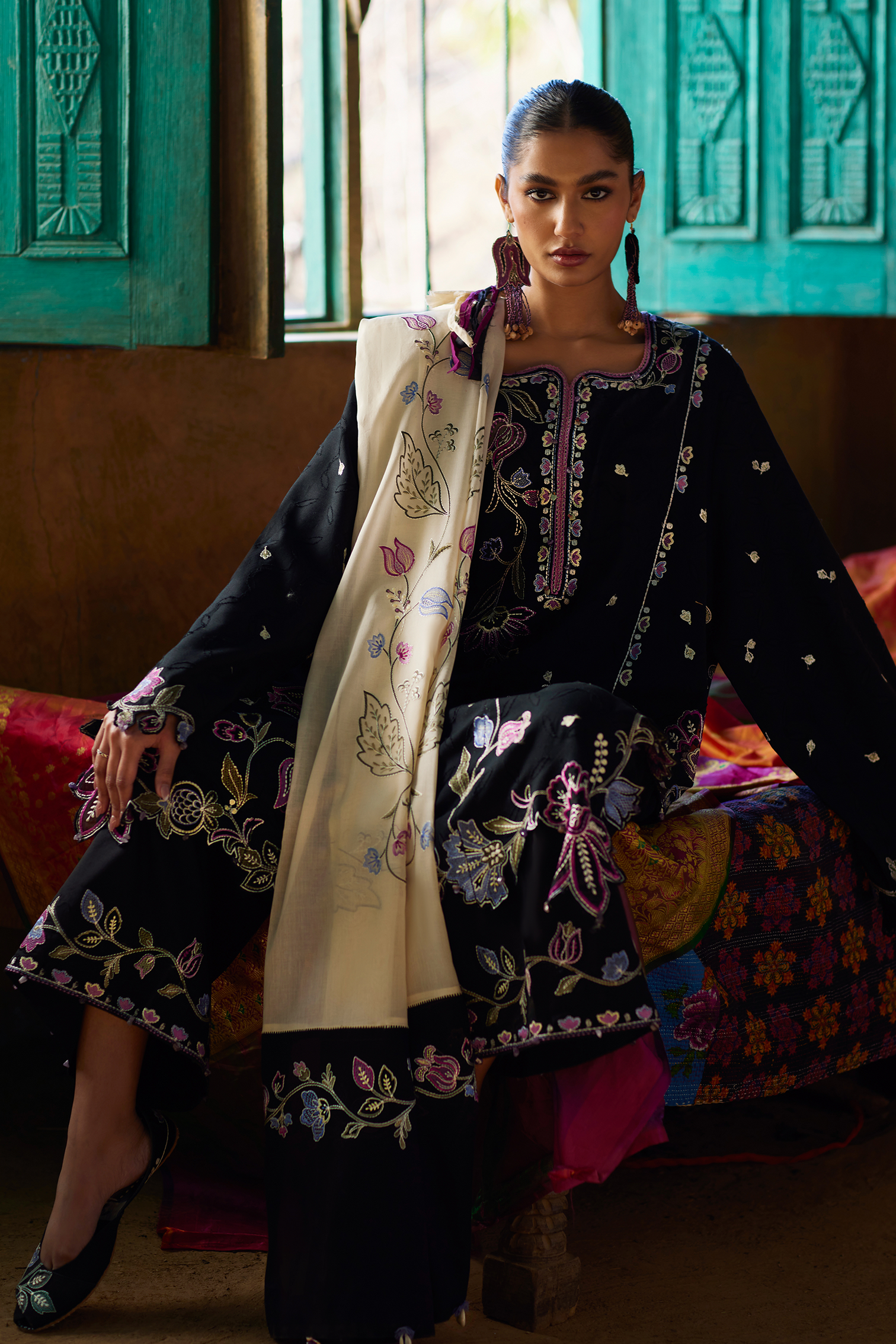 Paired with a contrasting ivory voile dupatta, delicately embroidered with floral sprigs, the look gains lightness and dimension. The soft drape of the dupatta offsets the richness of the black base, creating a balance that feels poised and effortlessly elegant.