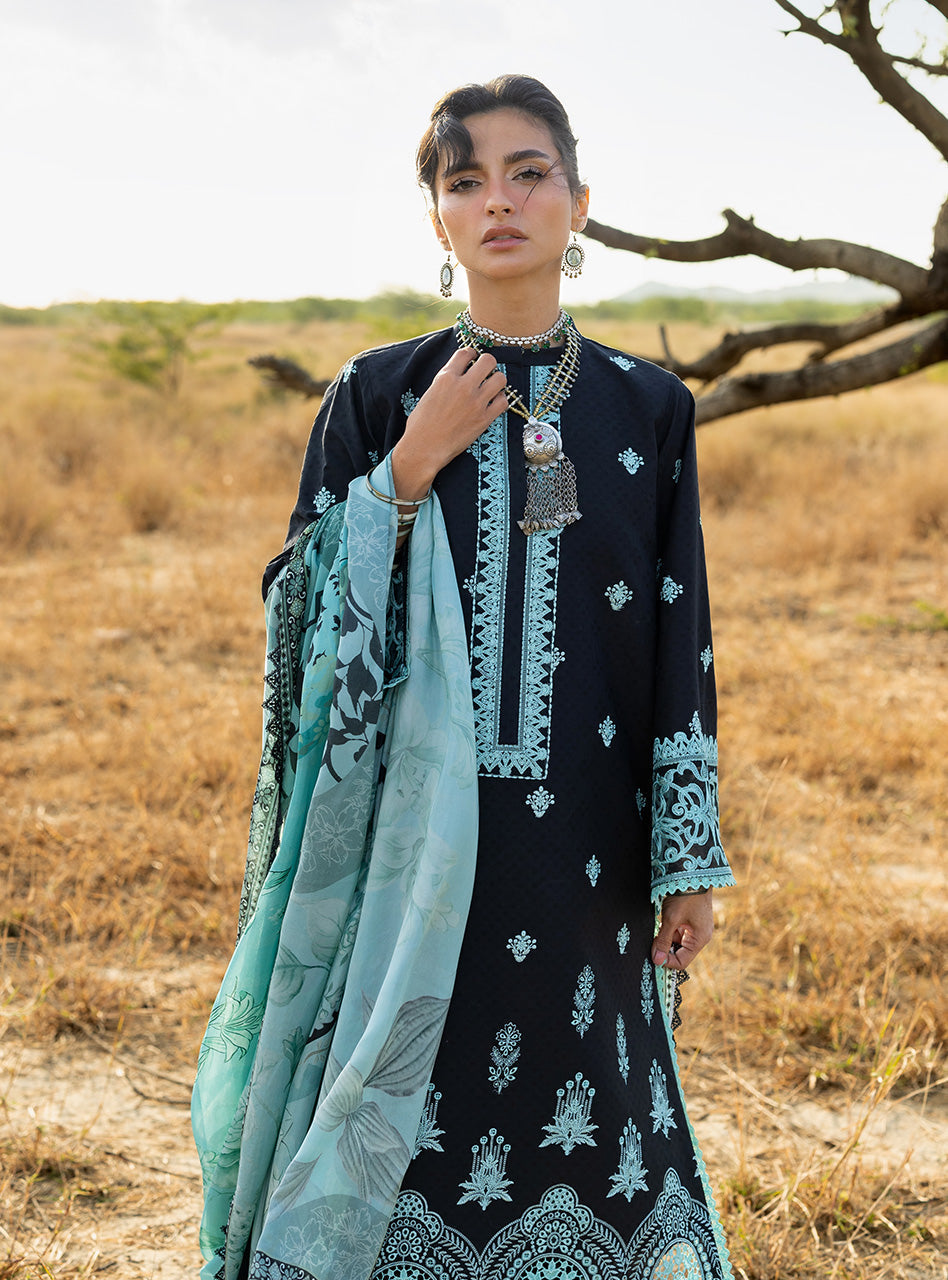 This striking black ensemble is elevated with intricate mint chikankari embroidery, creating a timeless silhouette infused with contemporary charm. The shirt is adorned with delicate embroidered motifs and a richly detailed hemline, offering a refined balance of artistry and sophistication. Paired with a statement printed dupatta in soft aqua hues, finished with contrasting borders, the look is effortlessly graceful. Perfect for formal gatherings, this ensemble embodies understated luxury with a bold, artistic edge.