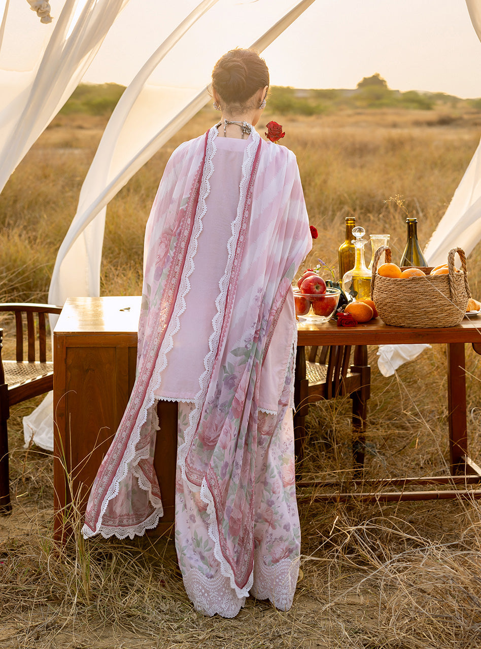 This full-length powder pink kameez features delicate white embroidery, creating a graceful and refined silhouette. Paired with a floral dupatta adorned with soft pink roses, the ensemble exudes timeless elegance, ideal for festive or formal occasions.