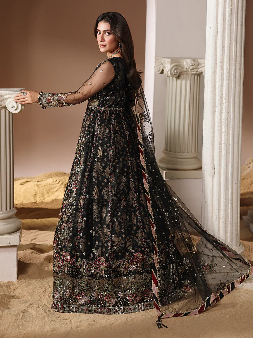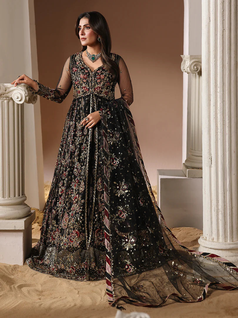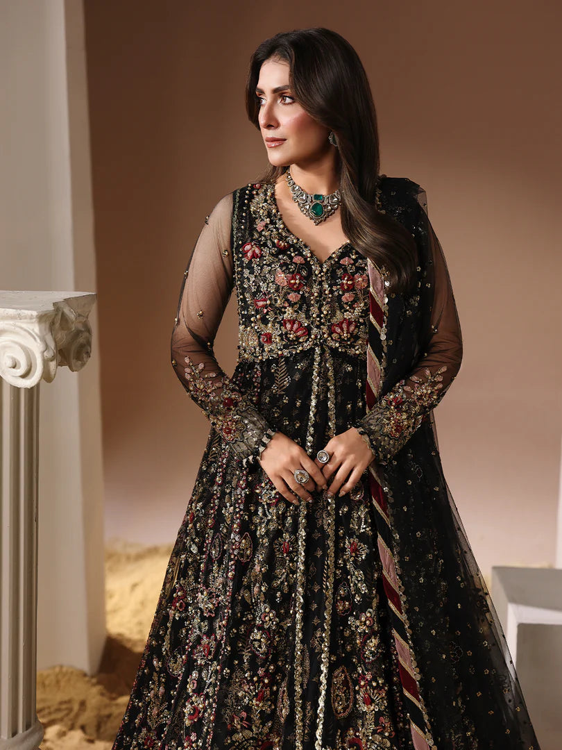 Net open maxi adorned with intricate sequin embroidery, hand-crafted adda work, naqshi dabka work, and cutdana stones.further enhanced by chainwork, crystals, and 3D floral embellishments, complemented by a viscose digital print inner layer.