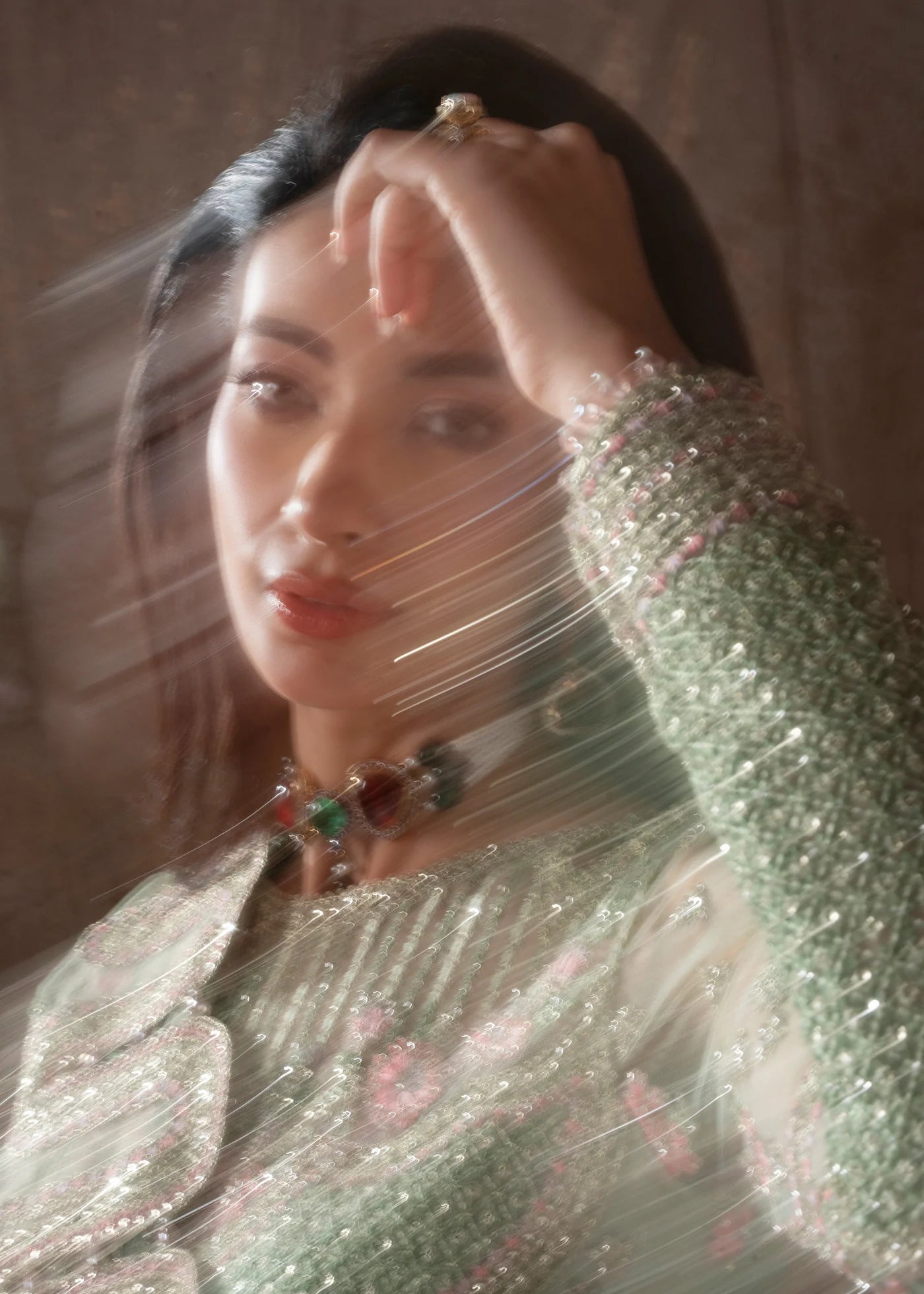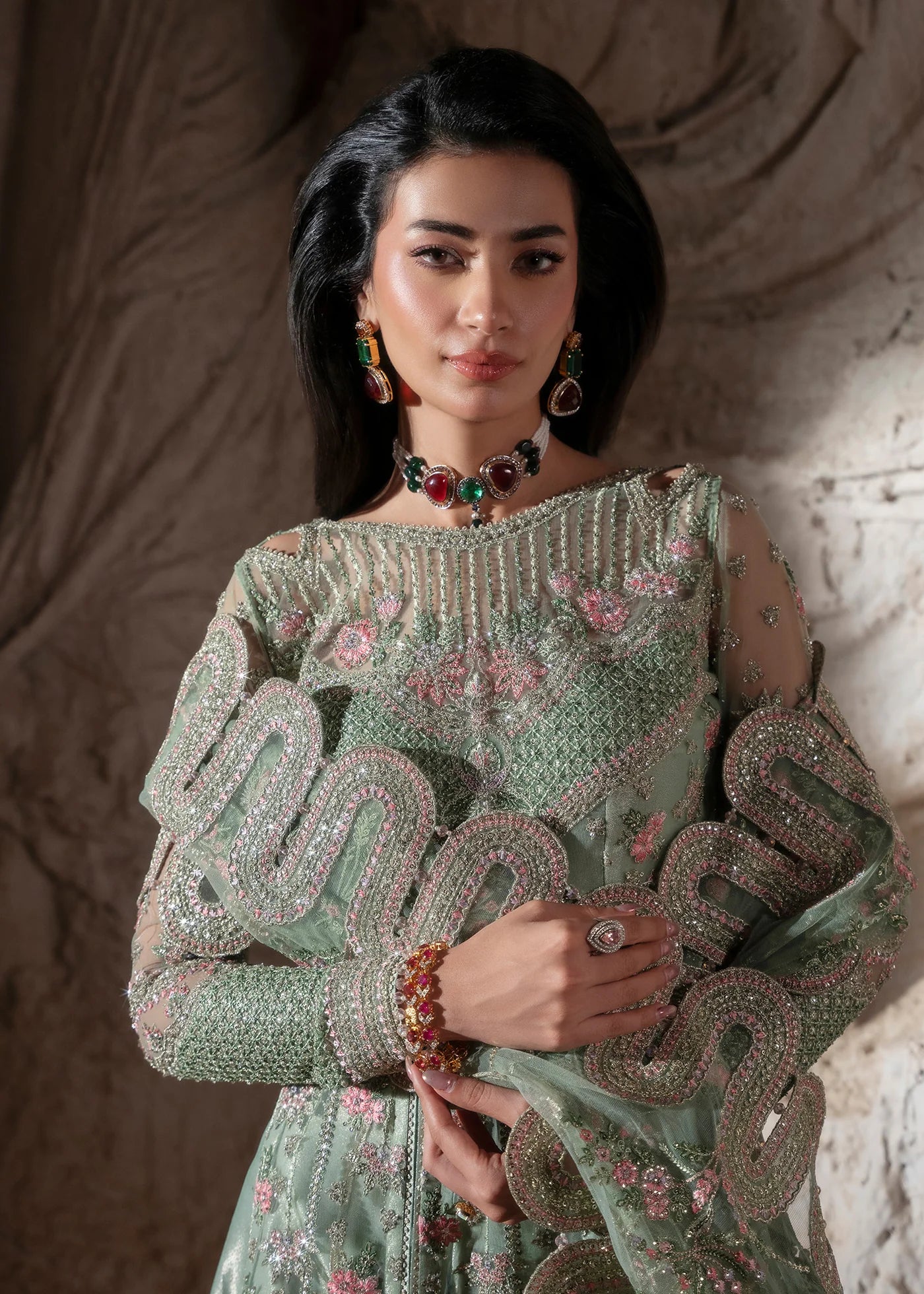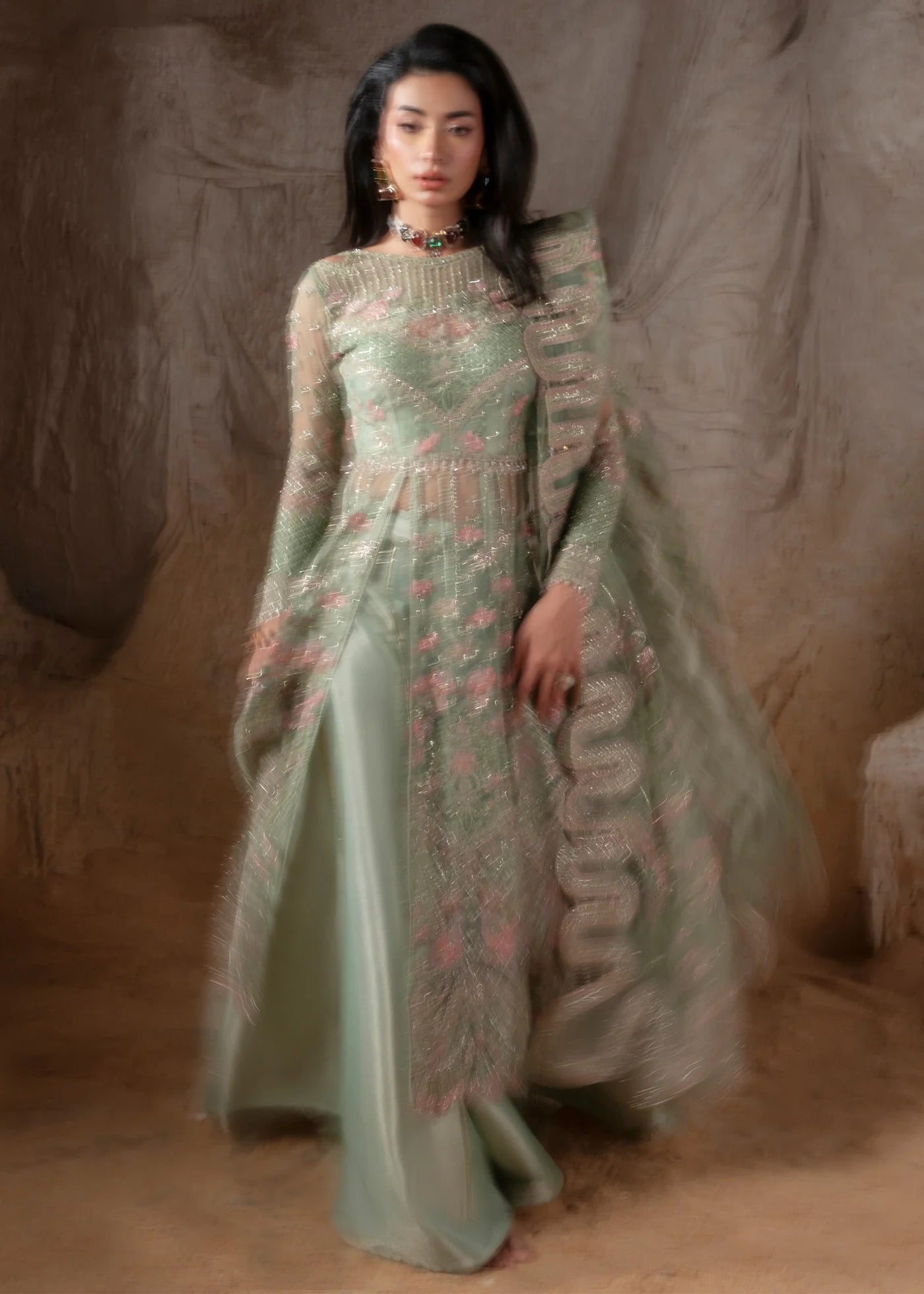 Glee captures soft elegance in a refreshing pista hue. The ensemble features an embroidered net shirt with delicate sleeves and a lace-detailed belt, paired with shimmering tissue trousers for a refined finish. An embroidered net dupatta adds a graceful touch, making Glee a perfect choice for festive gatherings and special occasions.