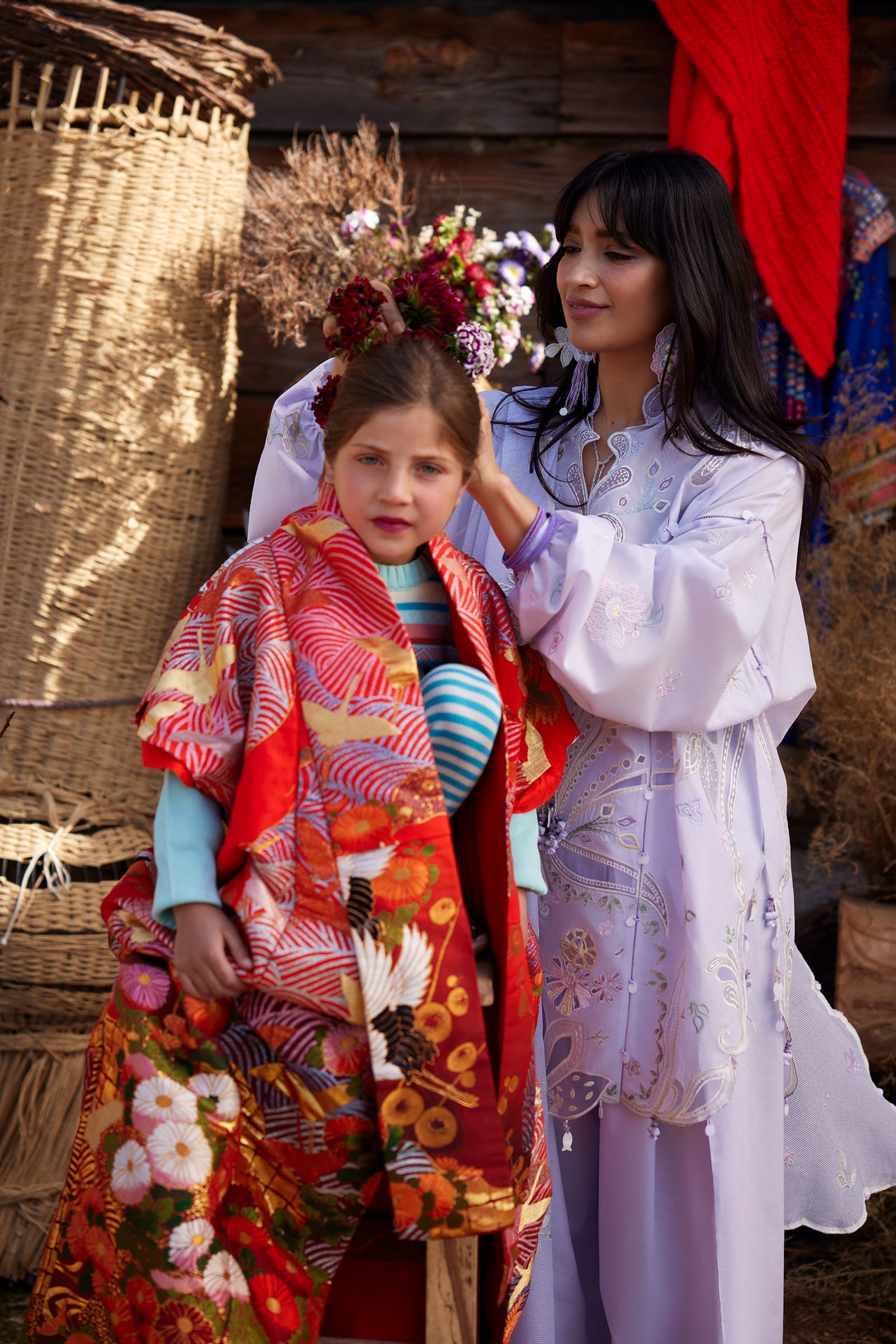 A vision of serene elegance, this soft lilac ensemble is delicately adorned with intricate floral and botanical embroidery in whispers of mint, blush, powder blue, and ivory. The pastel threadwork unfolds gracefully across the shirt, creating an aura of refined femininity and quiet charm.