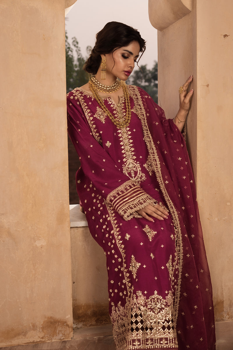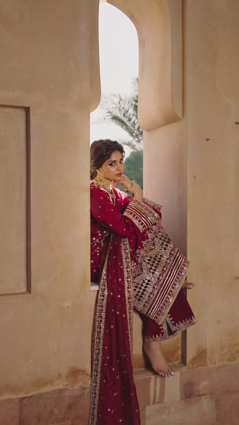 Zarin embodies understated opulence, crafted from Korean raw silk adorned with intricate embroidery and exquisite handwork featuring Swarovski, pearls, stones, and naqshi. Paired with a delicately embroidered organza dupatta, it reflects timeless craftsmanship and refined femininity - a true expression of grace, radiance, and sophistication.