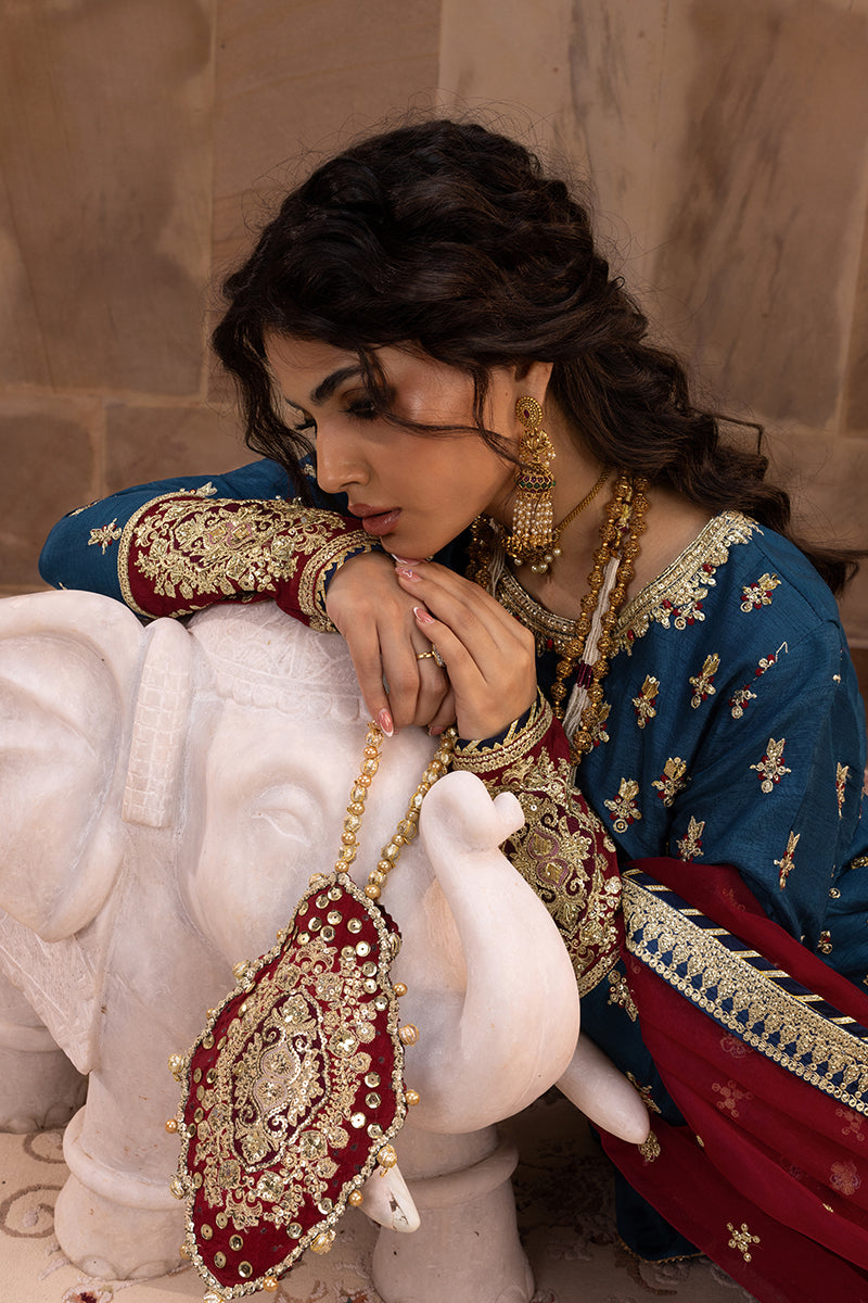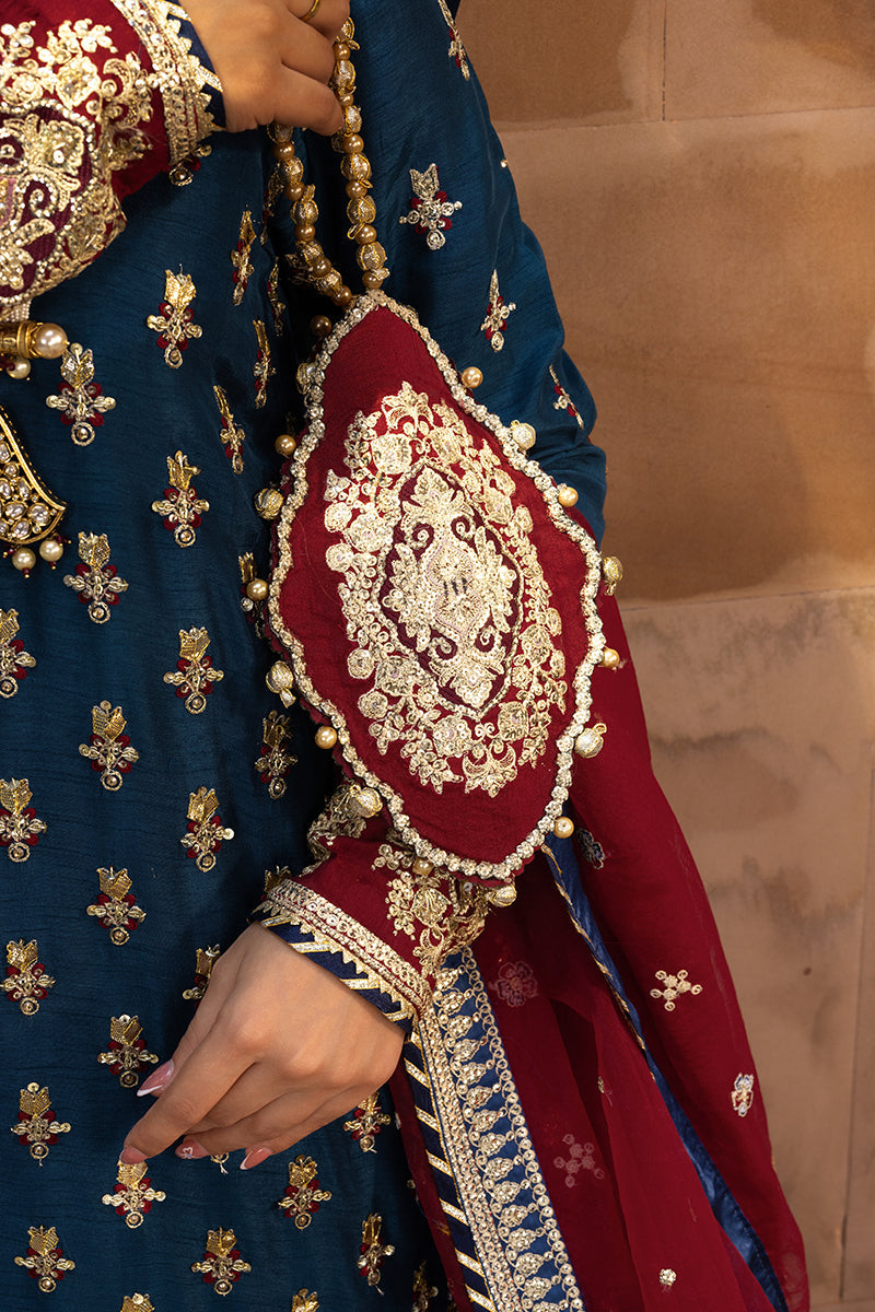 Mahnaz - A portrait of timeless elegance, crafted from lustrous silk adorned with exquisite handwork, Swarovski, pearls, gotta, and naqshi. Paired with an embroidered organza dupatta, it radiates classic allure and festive sophistication.