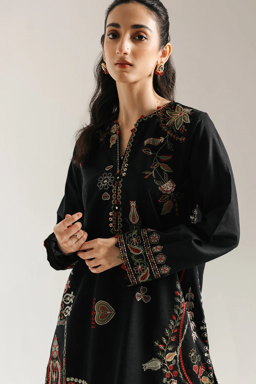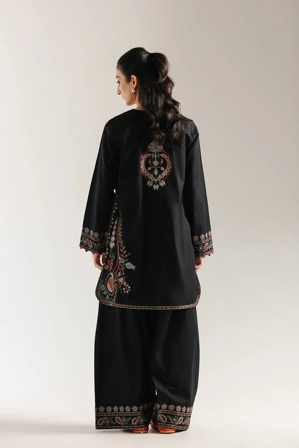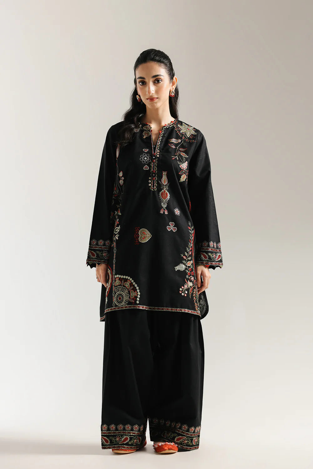 Experience the bold elegance of this stunning embroidered suit. This two-piece ensemble is a masterpiece of intricate design. The rich black base of the shirt serves as a dramatic backdrop for the beautiful floral and geometric embroidery in shades of red, white, pink, and green. The detailed threadwork and subtle sequin embellishments on the neckline create a look of opulent elegance. The suit is completed with matching farshi shalwar, making it an ideal choice for any festive event or special occasion.
