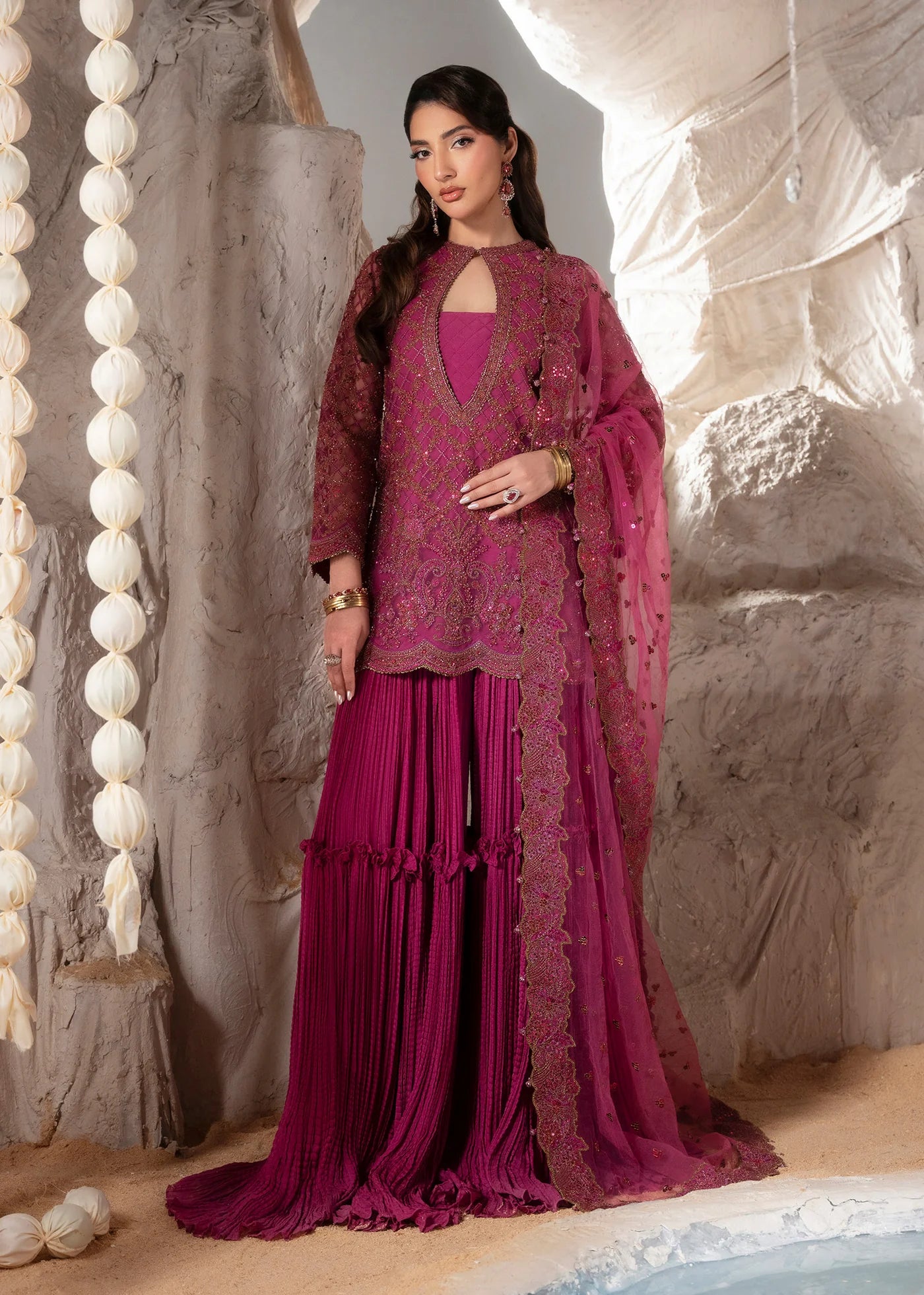 Plumore is a striking statement of elegance in a bold magenta hue. The ensemble features an embroidered net shirt with delicately worked sleeves, paired with flowing crushed silk trousers for a graceful silhouette. A beautifully embroidered net dupatta completes the look, making Plumore the perfect choice for festive gatherings and special occasions.