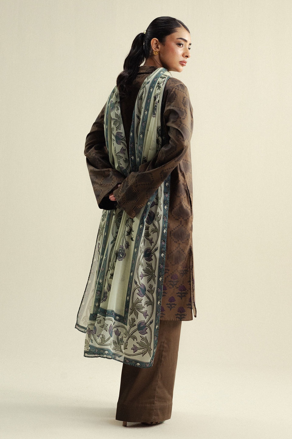 A bronze olive shirt set on a rich canvas, paired with a plain trouser and complemented by an off-white dupatta that adds lightness and balance.